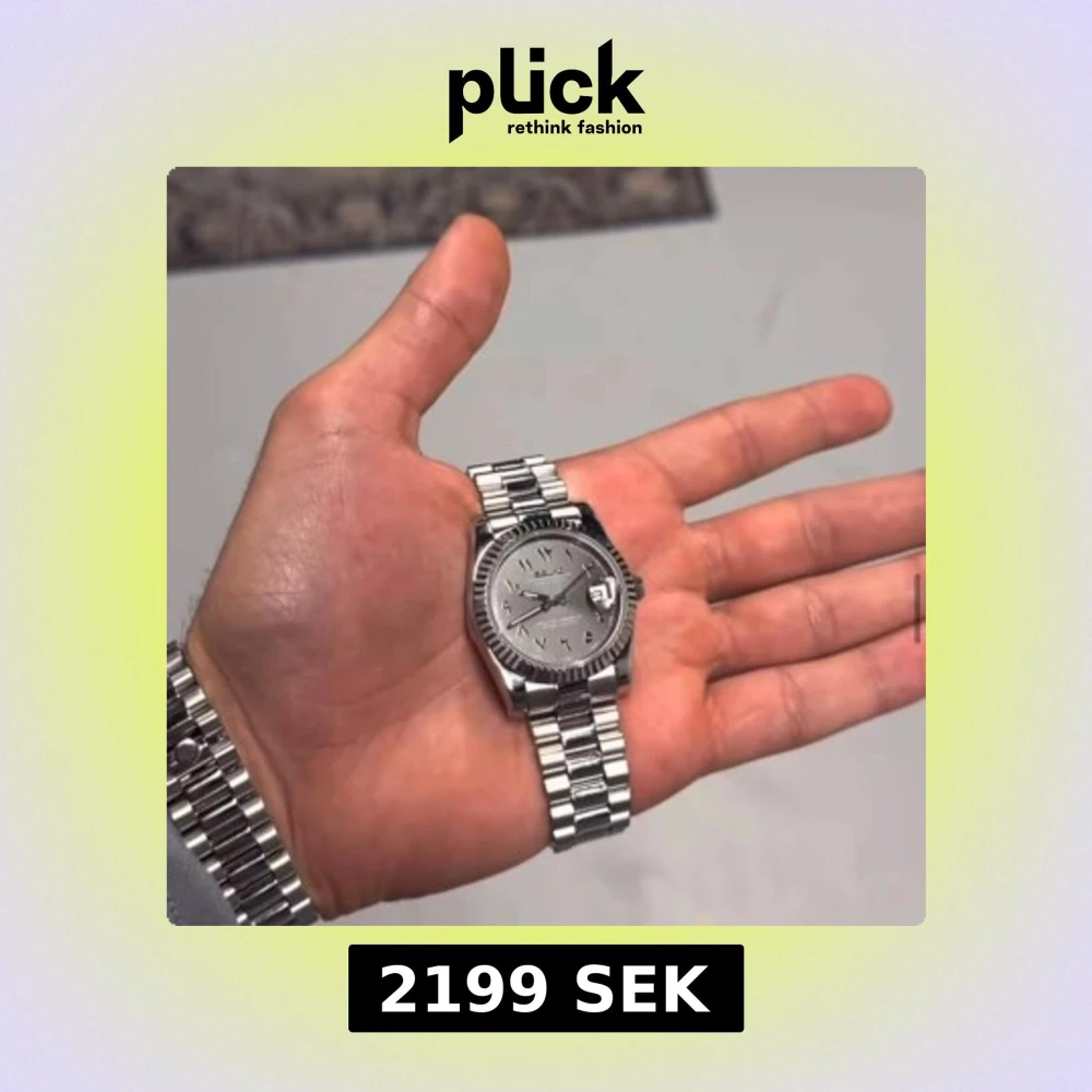 Elegant silverfärgad klocka med länkarmband och en detaljerad urtavla. Klockan har en klassisk design med tydliga markeringar och datumvisning. Perfekt för den som söker en stilren accessoar.