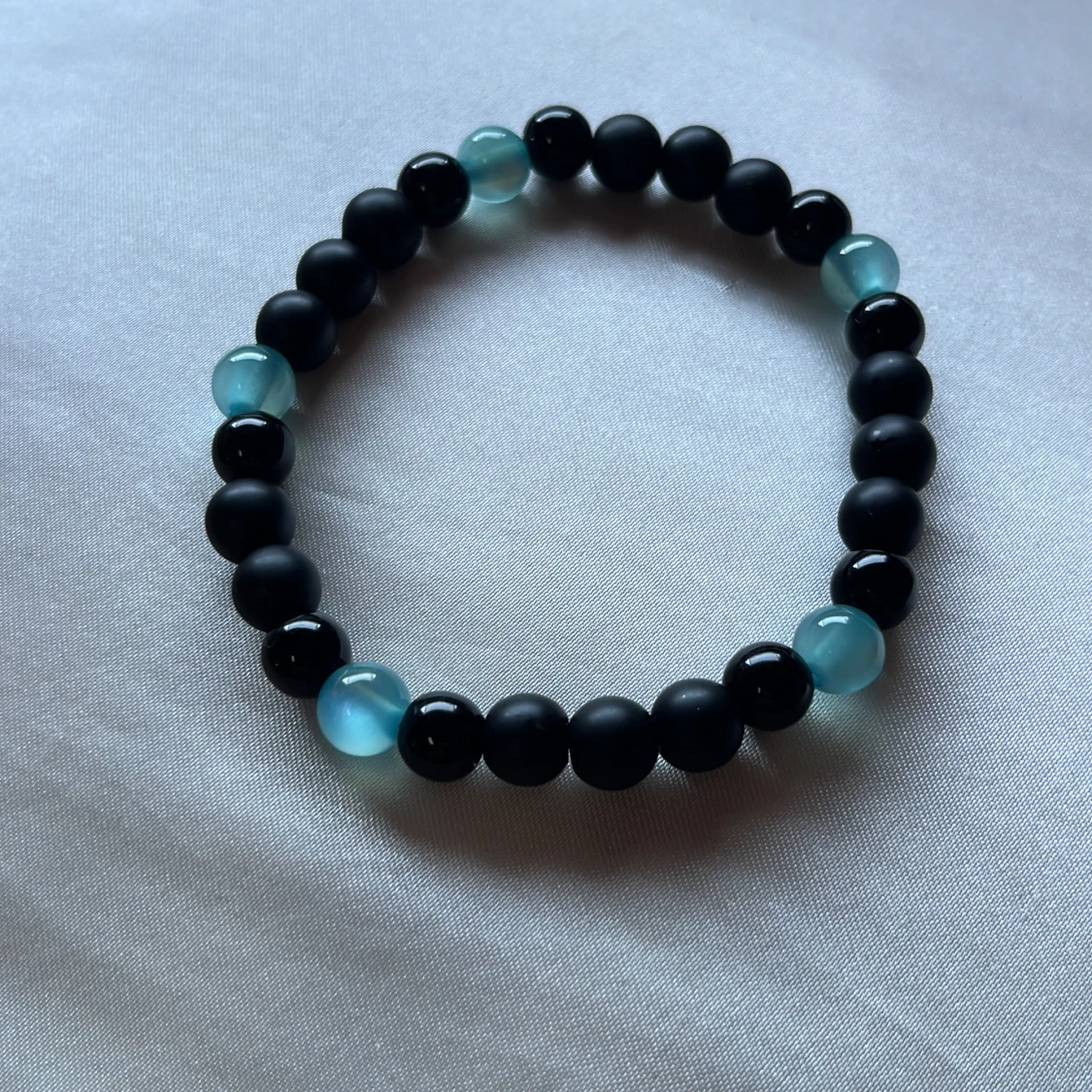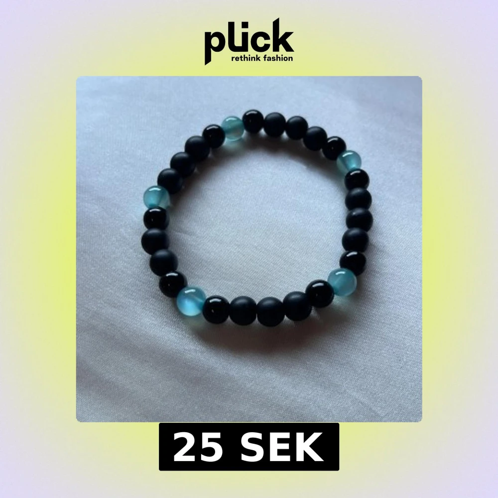 Stilrent armband med svarta och ljusblå pärlor på elastisk tråd. De svarta pärlorna är matta medan de blå är glansiga och ger en snygg kontrast. Perfekt accessoar för att lyfta din outfit med en cool och enkel vibe.