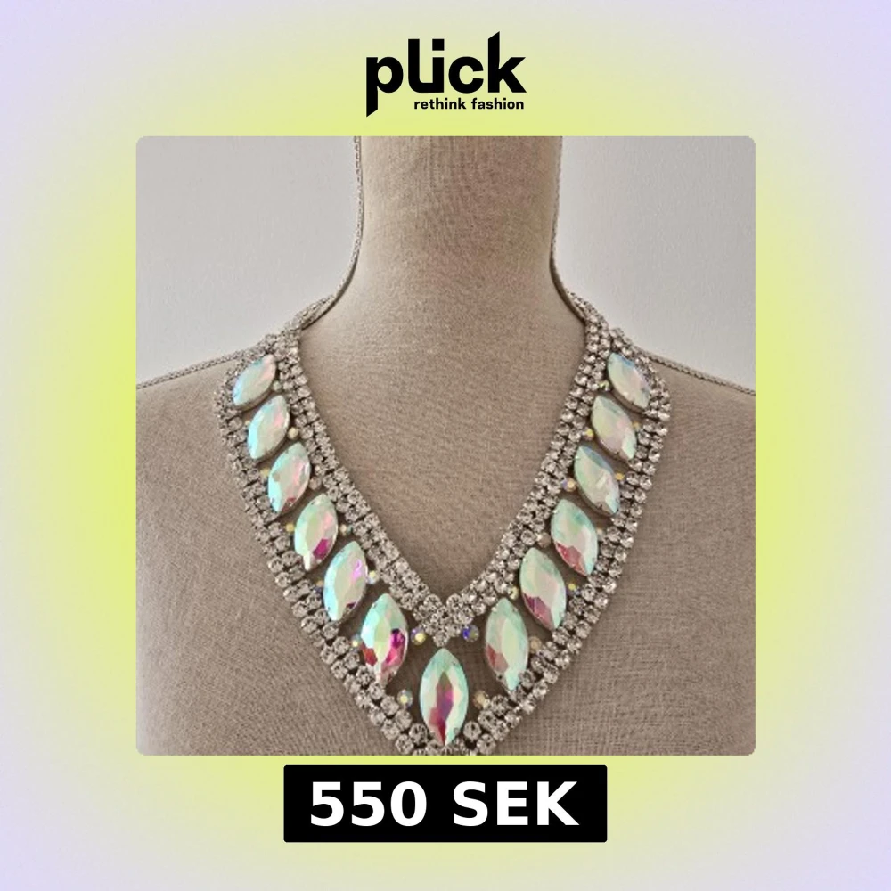 Superglammigt halsband med stora, iriserande stenar i droppform och massor av gnistrande strass. Halsbandet har en V-formad design som verkligen drar blickarna till sig. Perfekt för dig som vill sticka ut och älskar bling!