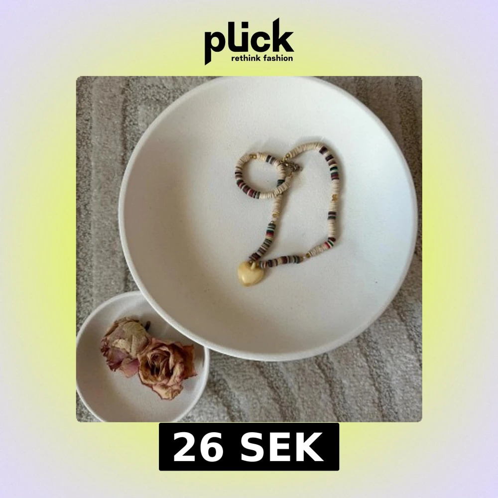 Unikt halsband med platta pärlor i beige, grönt, rött, svart och lila. Halsbandet har ett gulligt hjärthänge i ljusgul nyans och små guldfärgade detaljer. Perfekt accessoar för att lyfta din outfit med en lekfull touch.