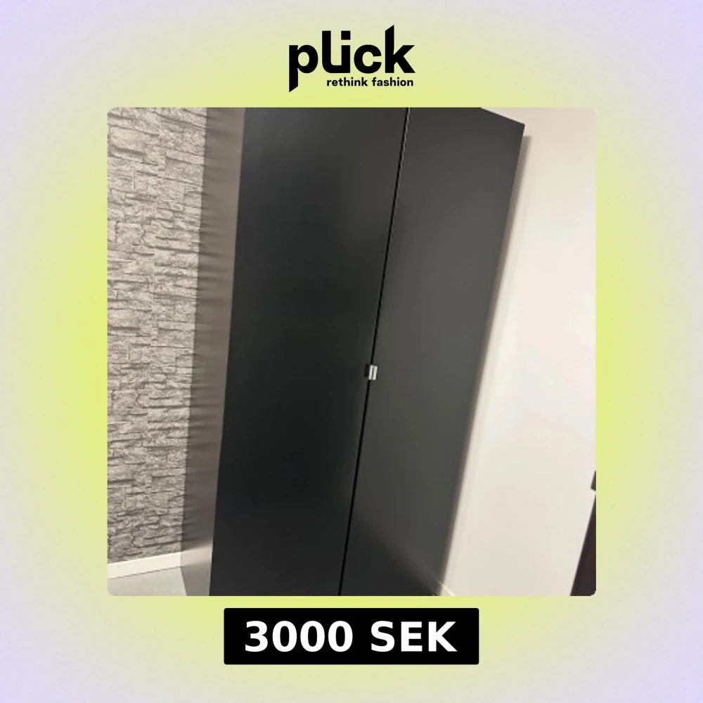 Svart garderobsskåp med två dörrar, en klädstång, en glashylla och två utdragbara nätkorgar. Skåpet ser modernt ut och är i gott skick utan skador eller slitage. Perfekt för förvaring av kläder och accessoarer i sovrum. Längd: 2m, bredd: 1m, djup: 50cm. Priset kan diskuteras vid snabb affär, hämtas på plats☺️