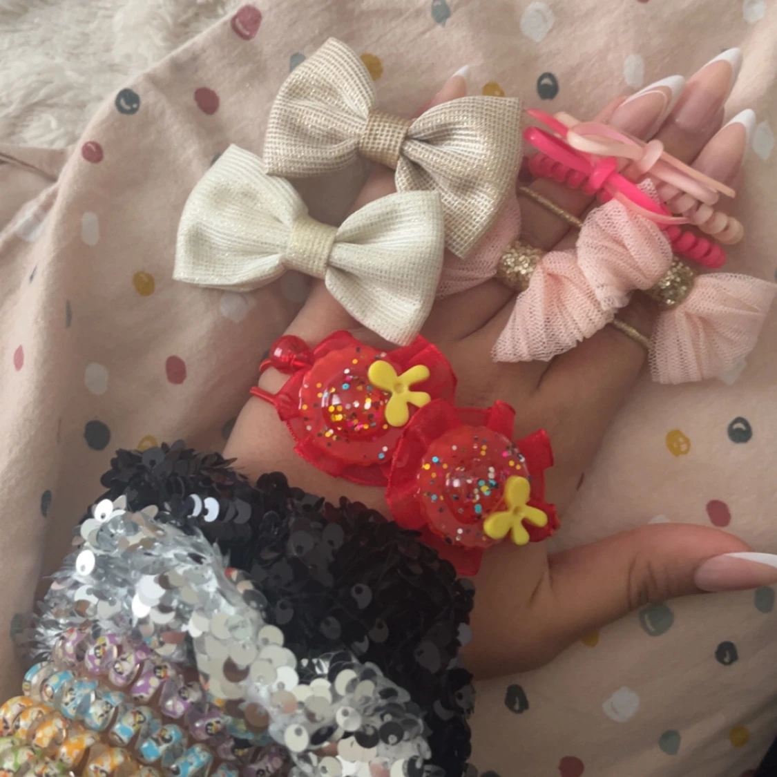 Flera hårsnoddar med stora rosetter i beige och rosa samt två röda snoddar med glittriga dekorationer och små gula detaljer. Perfekt för att piffa upp frisyren med färg och lekfull stil.