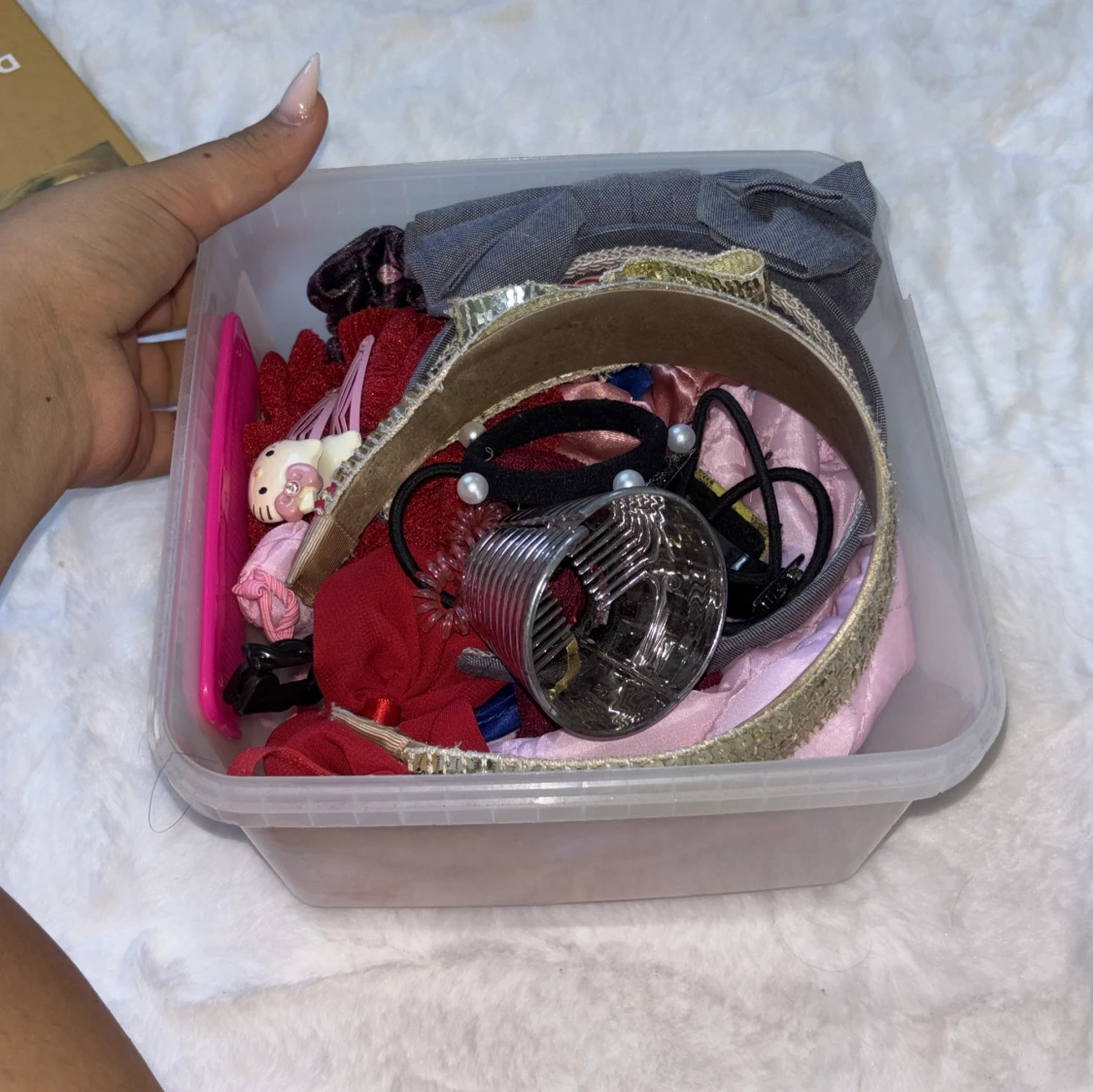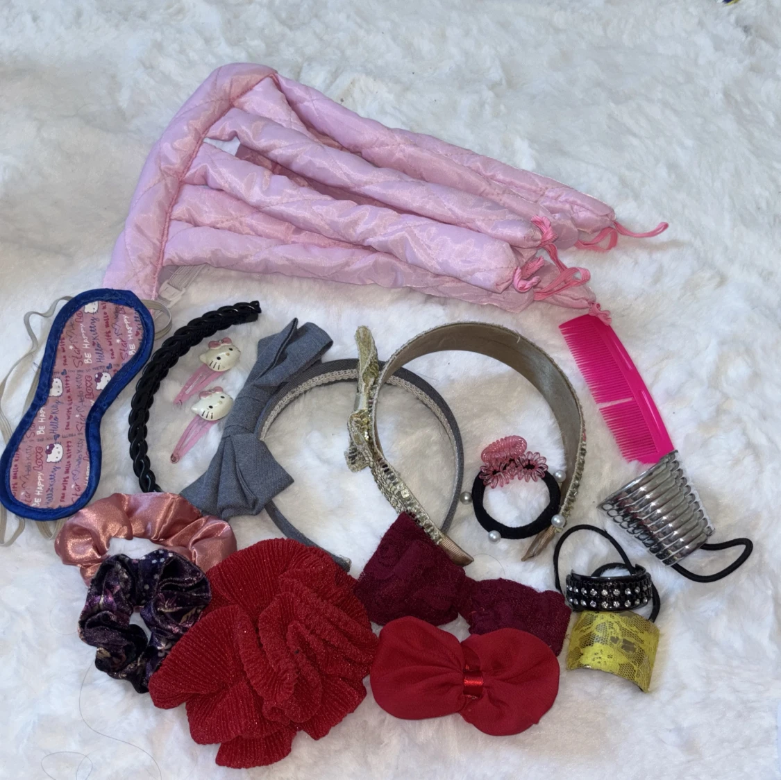 Säljer ett kit med flera diadem i grått och guld, scrunchies i rött, rosa och sammet, hårband, hårspännen med Hello Kitty, hårsnoddar med pärlor och nitar samt en rosa satin värmerulle för håret. Perfekt för dig som vill variera din look med färgglada och trendiga accessoarer.
