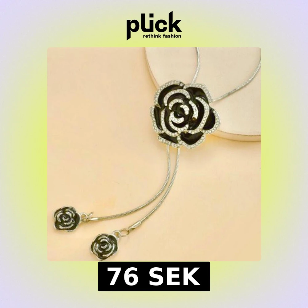 Unikt halsband i silverfärg med en stor ros som hänge, dekorerad med glittrande stenar. Två mindre rosor hänger i tunna kedjor från huvudmotivet. Snygg och iögonfallande design som verkligen sticker ut och ger en cool vibe till din outfit.
