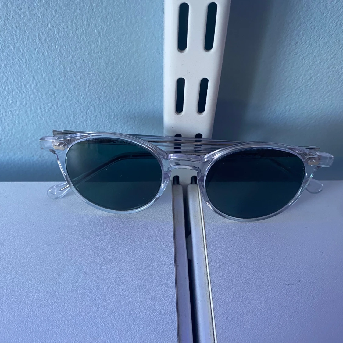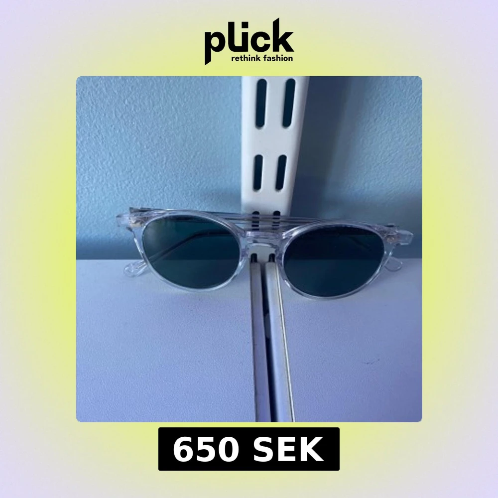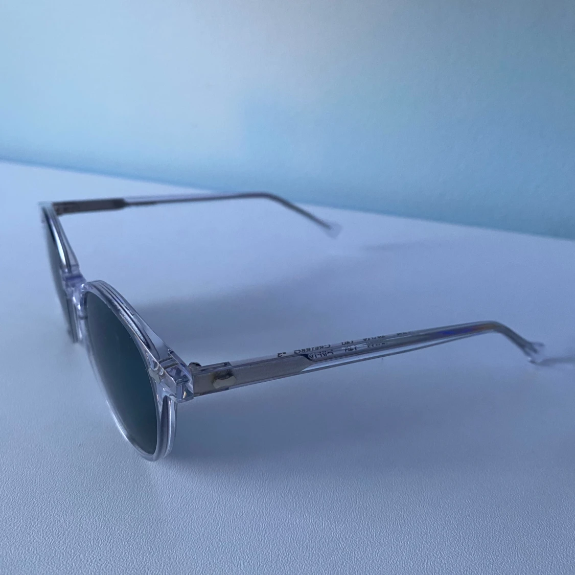 Snygga solglasögon med transparent båge och mörka runda linser från TBD Eyewear. Modellen heter CRAN och har en stilren och modern design som passar perfekt till sommaren. Små repor förekommer men allmänt i bra skick. Säljer då de ej kommer till användning.