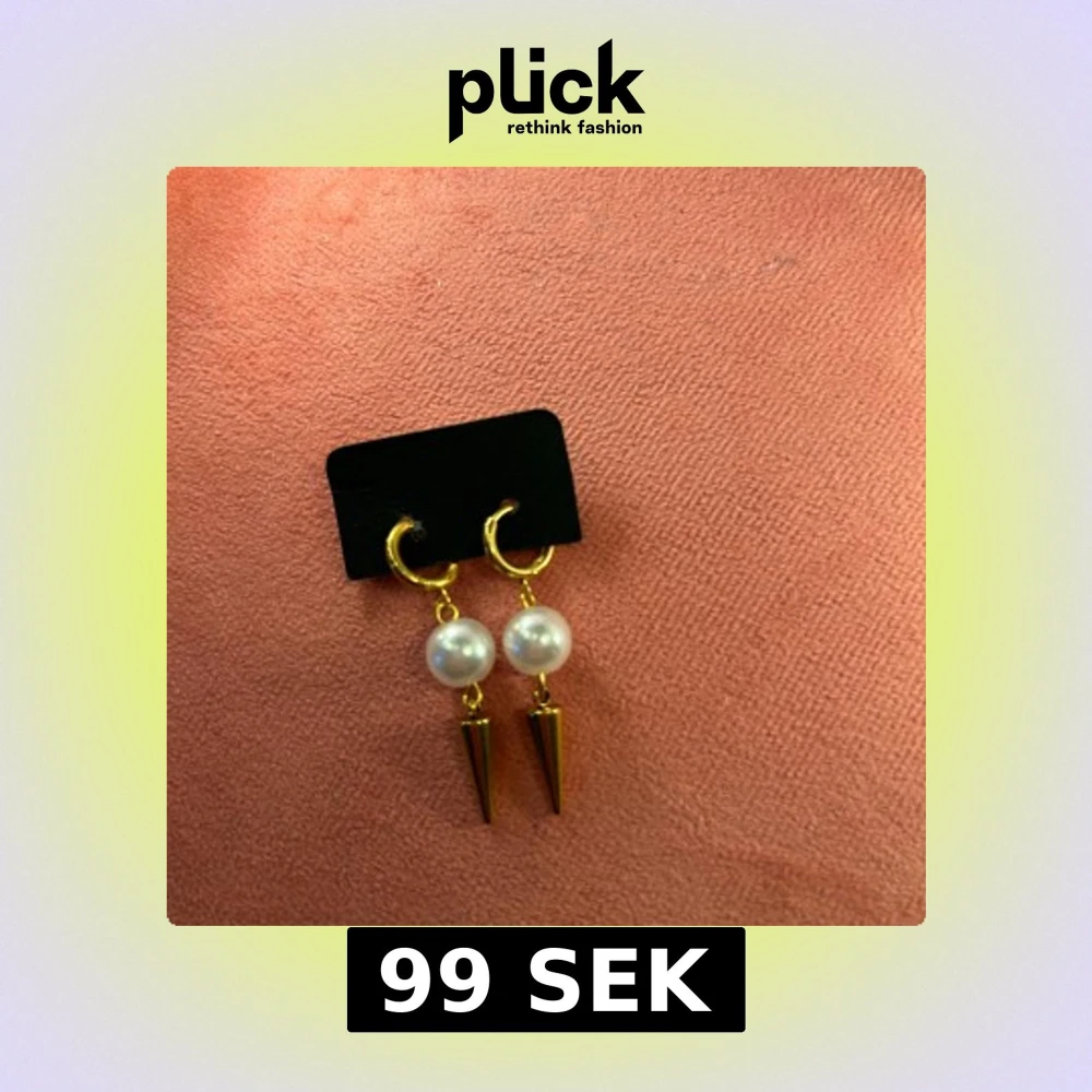 Säljer ett par trendiga örhängen i guld med hängande vita pärlor och spetsiga konformade hängen. Perfekta för att ge din outfit en cool och elegant touch.