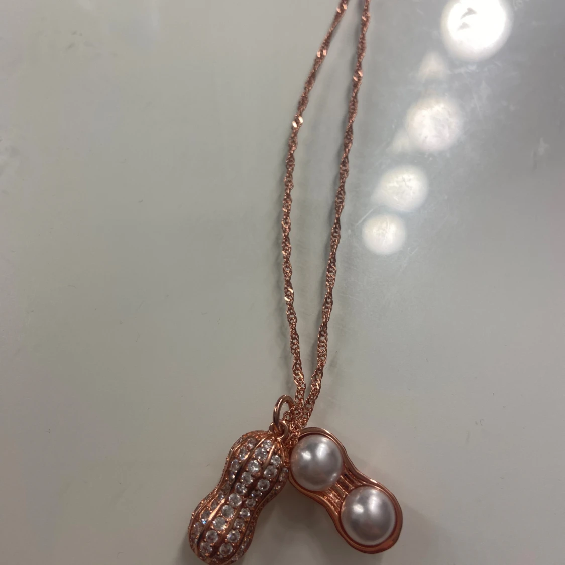Halspand i roséguld med en jordnötsformad berlock. Inte använd! Nypris 99kr