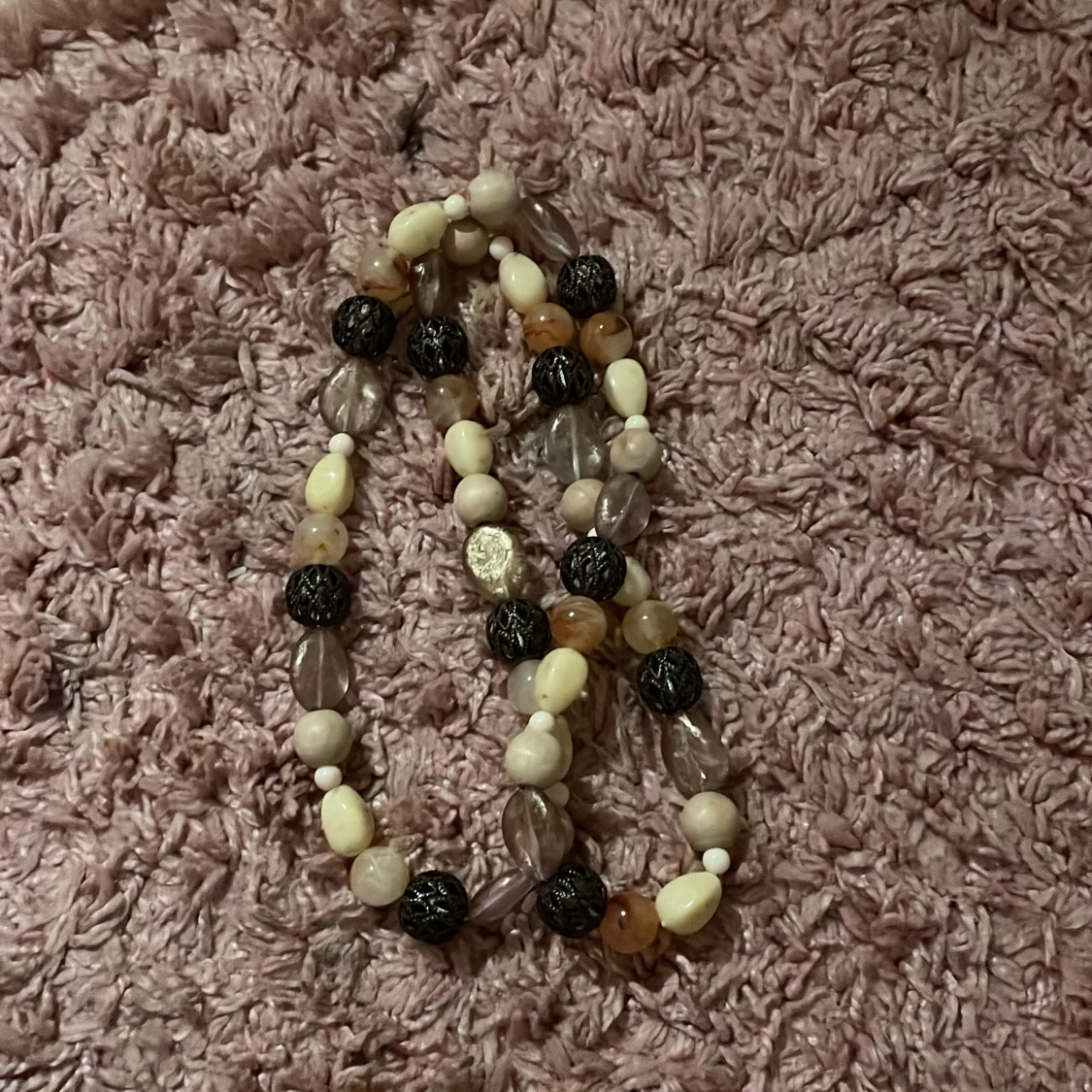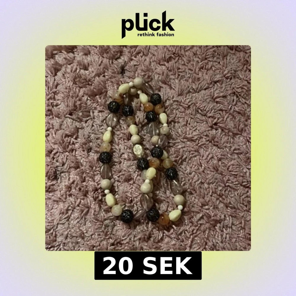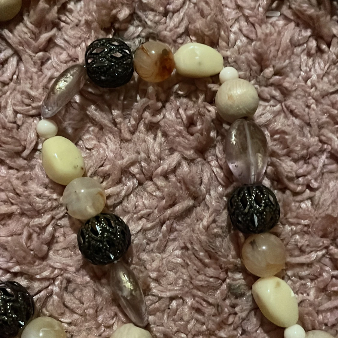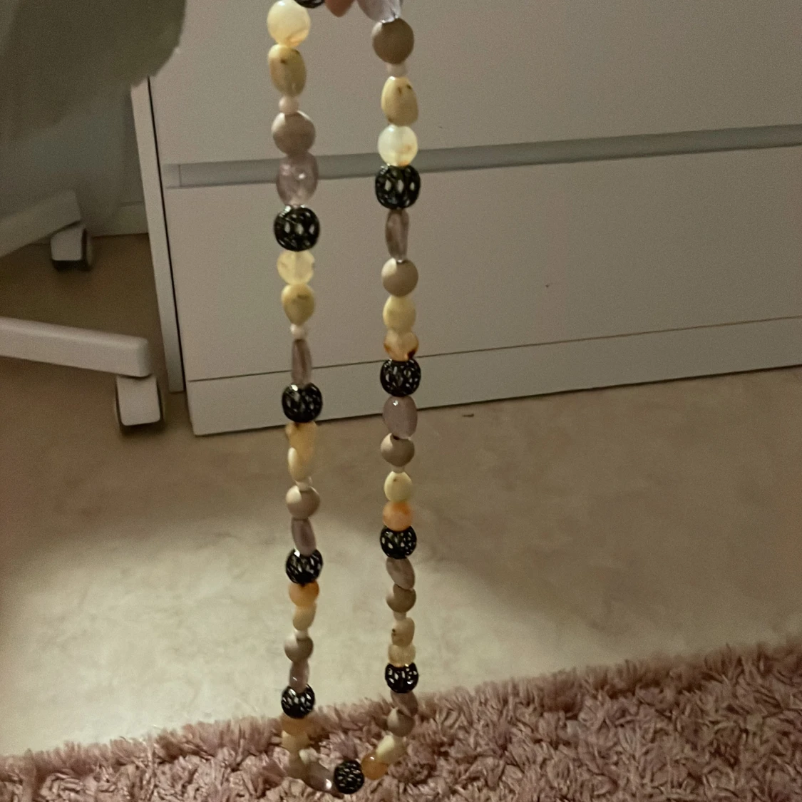 Unikt långt halsband med pärlor i beige, vitt och transparent lila, blandat med svarta, runda metallpärlor. Pärlorna har olika former och storlekar vilket ger ett coolt och bohemiskt uttryck. Perfekt för dig som gillar att sticka ut med accessoarer.