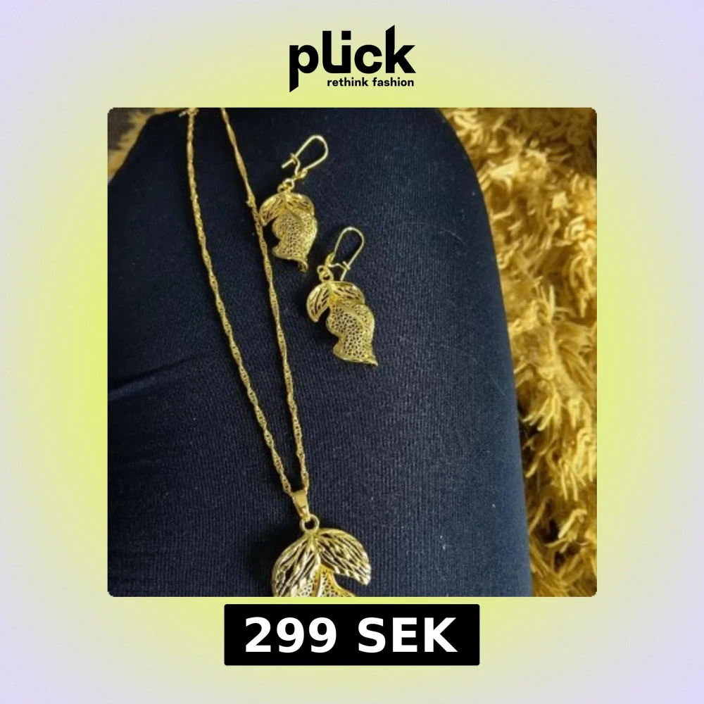 Snyggt smyckeset med halsband och örhängen i 18k guldpläterad . Både hänget och örhängena har ett detaljerat bladmotiv med fin struktur och glansig finish. Kedjan är tunn och tvinnad, vilket ger en elegant look. Perfekt för dig som gillar naturinspirerade accessoarer.