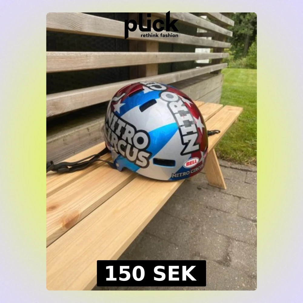 Snygg Nitro Circus hjälm från Bell med coolt mönster i rött, blått och silver, prydd med vita stjärnor och stora logotexter. Rund form med flera ventilationshål och justerbart hakband. Perfekt för dig som gillar action och vill sticka ut.