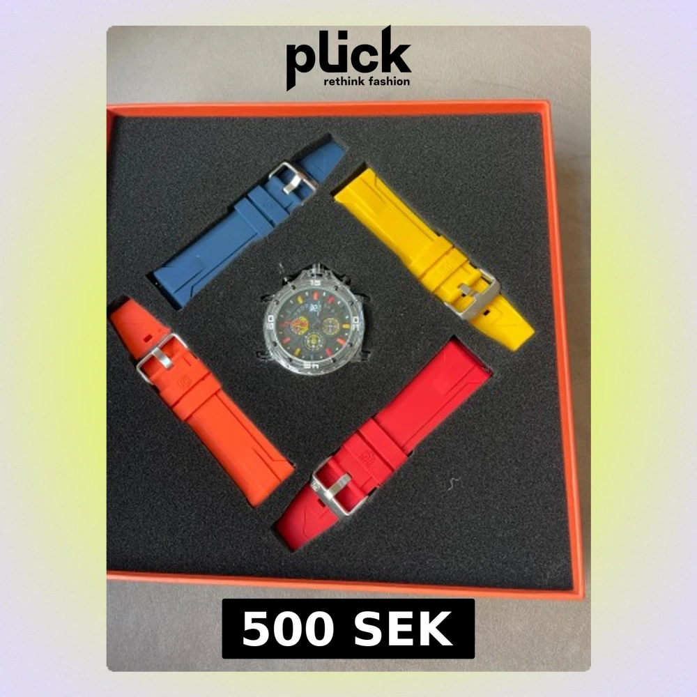 Säljer en sportig T5 klocka med transparent boett och svart urtavla med färgglada detaljer. Klockan kommer med fyra utbytbara silikonband i blått, gult, rött och orange. Boetten är rund och har flera knappar på sidan. Perfekt för dig som gillar att variera din stil.