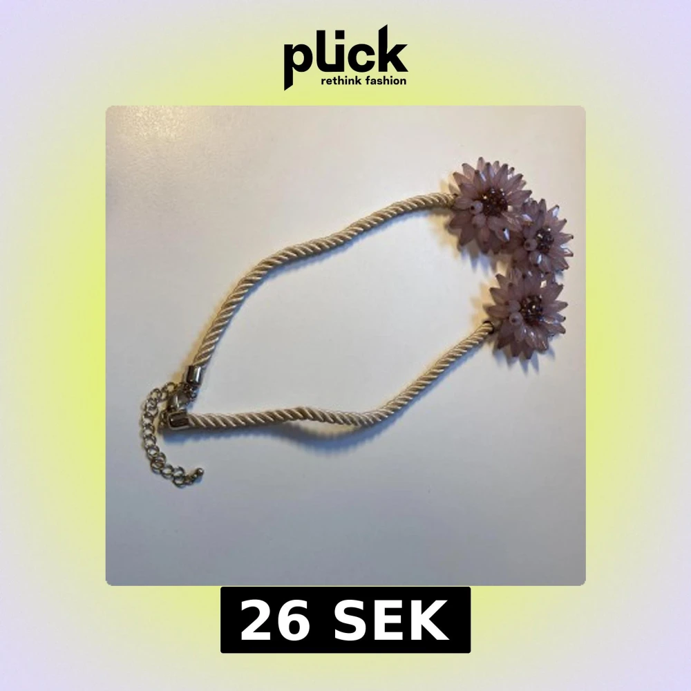 Unikt halsband med tre stora lila blommor i plast och glittriga pärlor i mitten. Kedjan är tvinnad i beige och har justerbar längd med metallspänne. Perfekt statement-piece för dig som vill sticka ut med färg och cool design.
