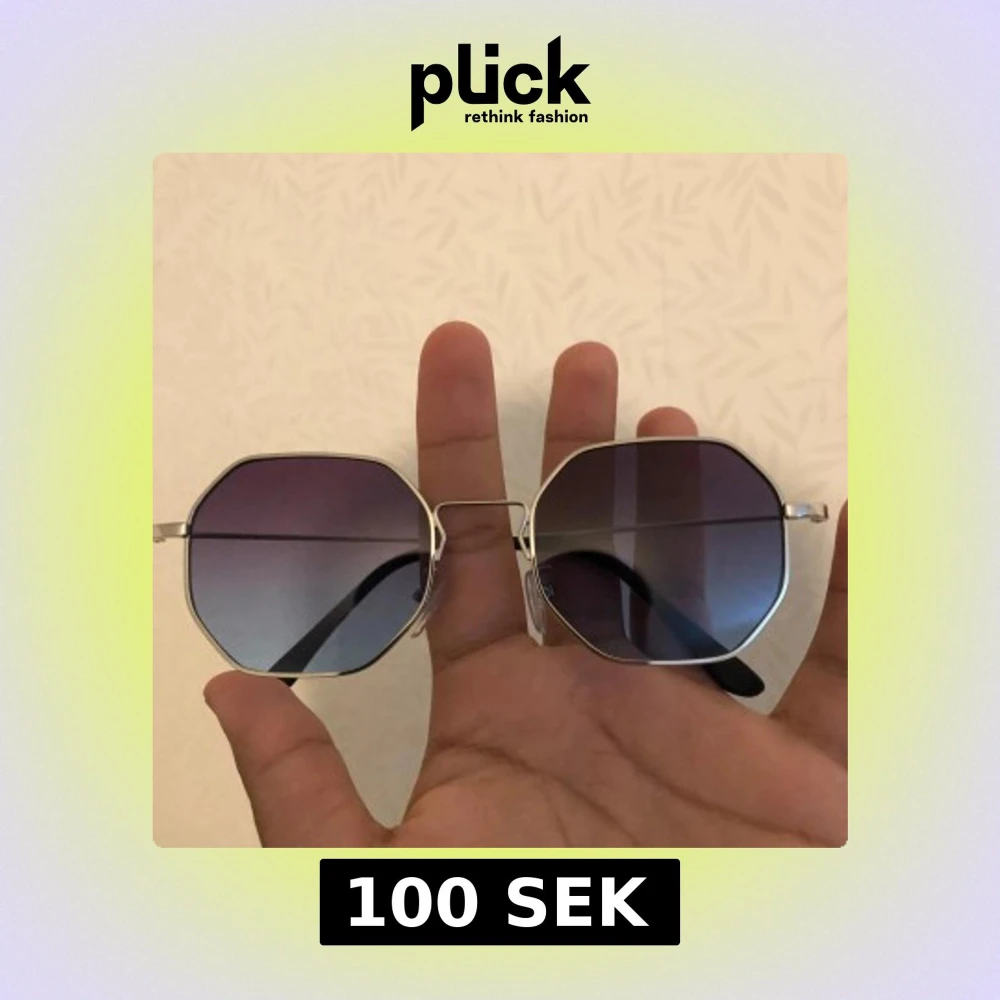 Snygga solglasögon med åttakantiga glas och tunn silvrig metallbåge. Glasen har en mörk toning som går från lila till blått, vilket ger en cool och modern vibe. Perfekta för att sticka ut i mängden och ge din stil en extra edge.