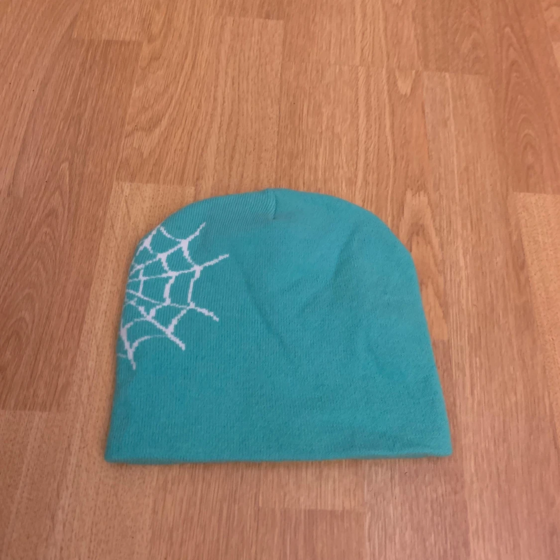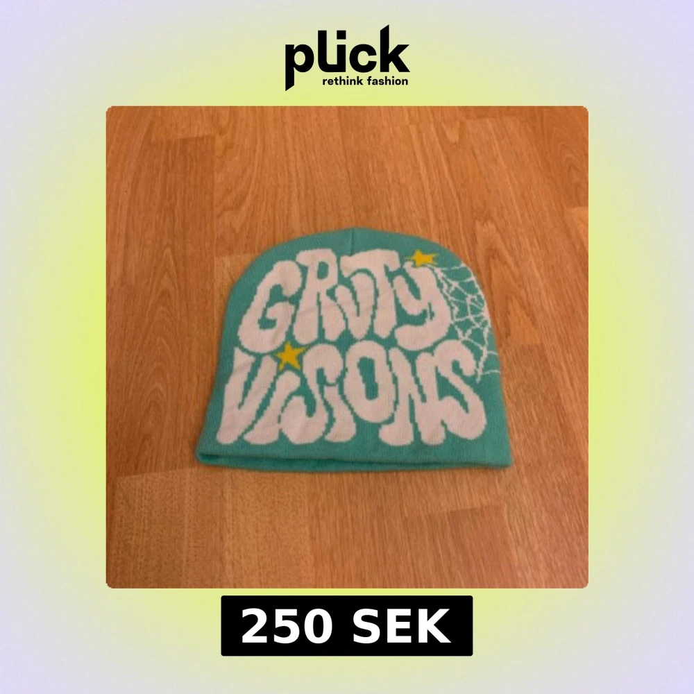Cool turkos mössa med texten 'GRAVITY VISIONS' i vitt och en stjärna i gult. Har ett spindelnätsmönster på sidan. Perfekt för att sticka ut i mängden!