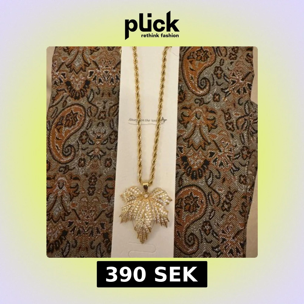 Elegant guldhalsband med ett stort lövformat hänge dekorerat med glittrande stenar. Kedjan är tvinnad och ger en lyxig känsla. Perfekt för att ge en touch av glamour till din outfit. 14k Guldpläterad