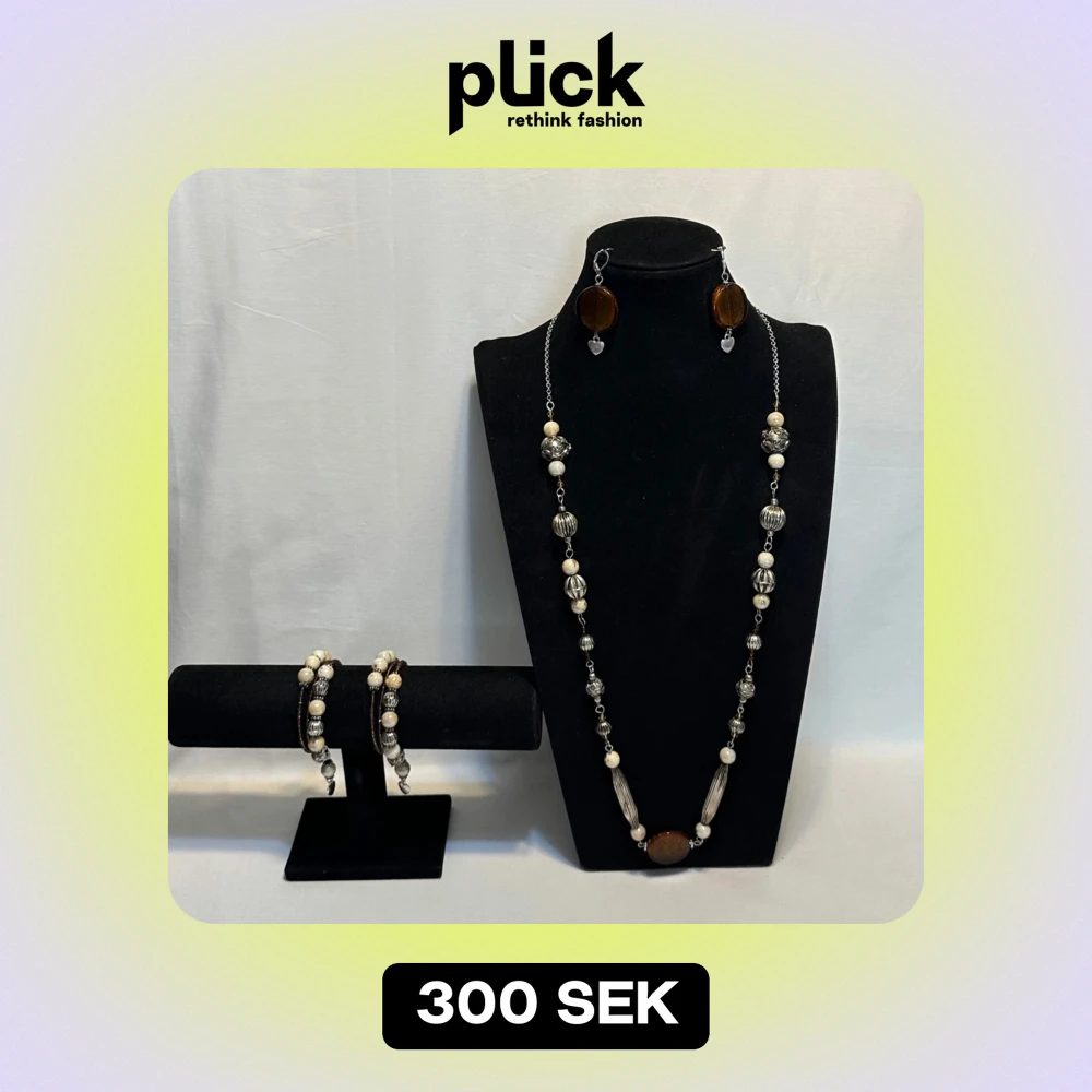 Snyggt smyckeset med ett långt halsband, matchande armband och örhängen. Halsbandet har pärlor i olika storlekar och färger, inklusive silver och brunt. Armbanden är elastiska med liknande pärlor. Örhängena har stora, runda bruna hängen. Perfekt för att ge en bohemisk touch till din outfit! Ett par örhängen och ett par armband plus en halsband handgjorda mycket mycket fint nytt oanvänd