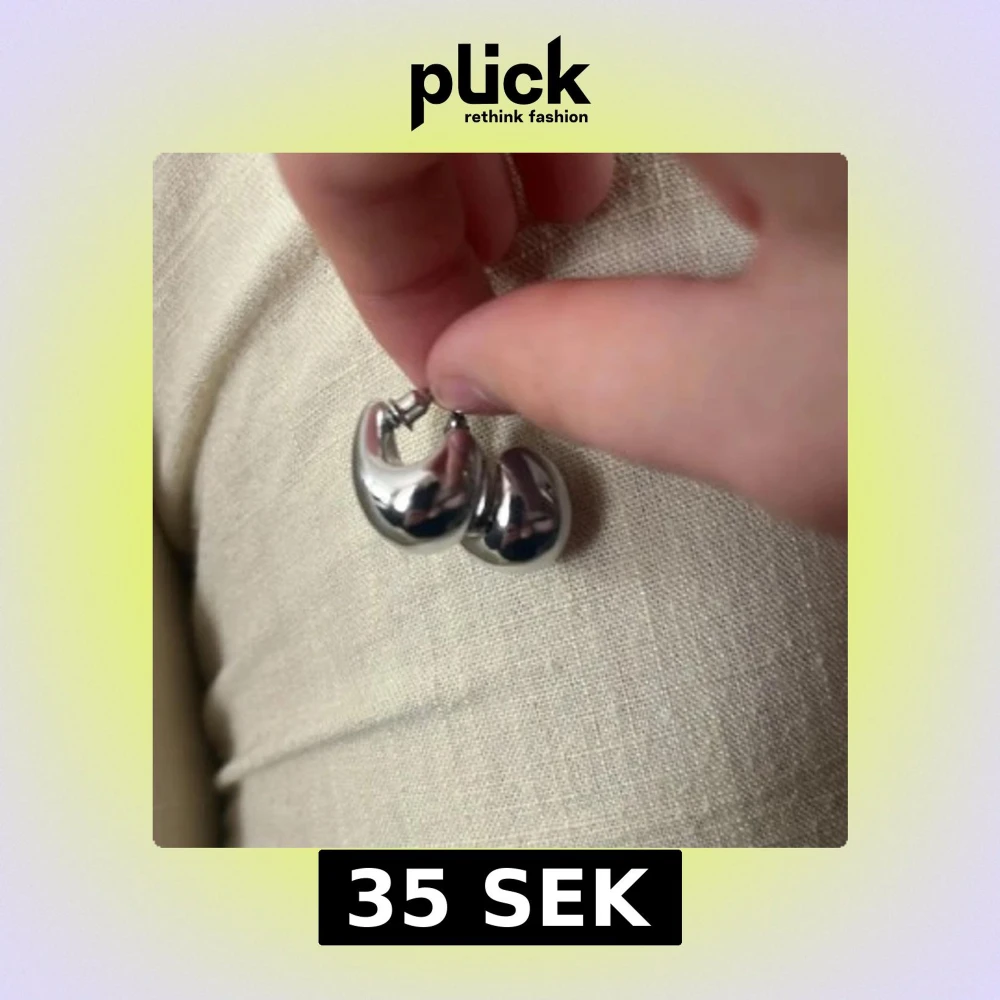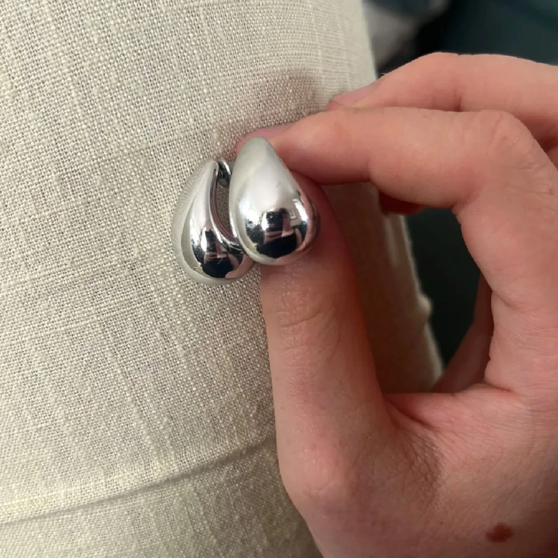 Säljer ett par chunky örhängen i droppform med blank, silvrig finish. De har en modern och cool vibe, perfekta för att lyfta din stil. Örhängena är i metall och har en unik, rundad design som verkligen syns.