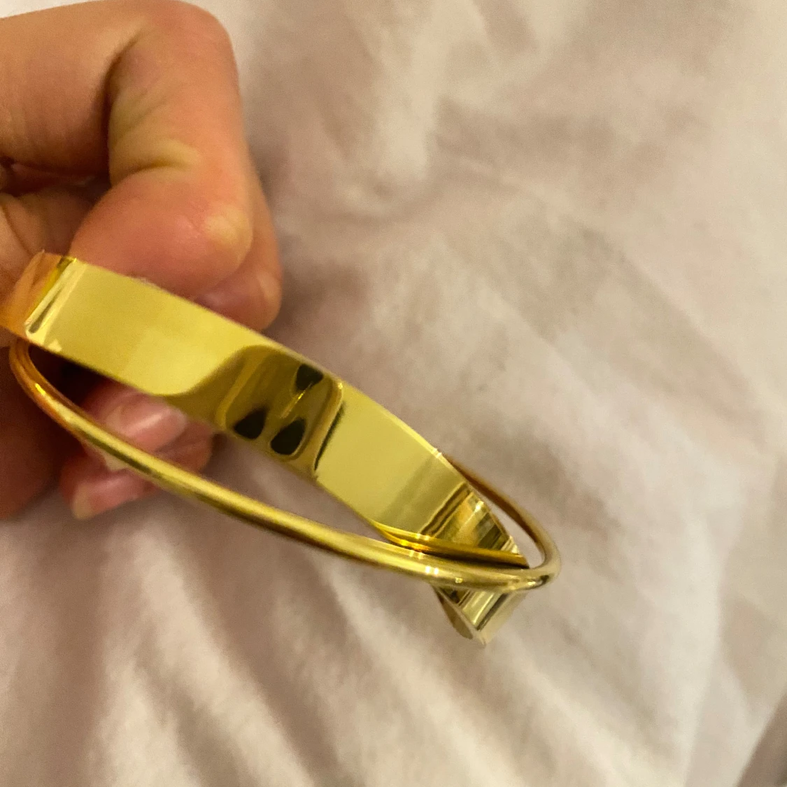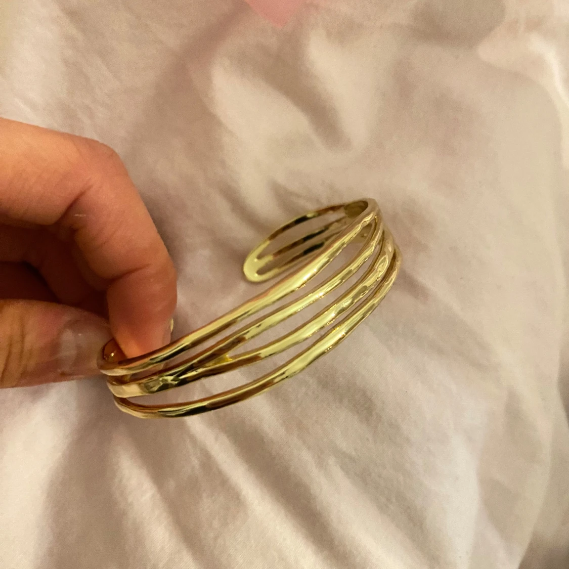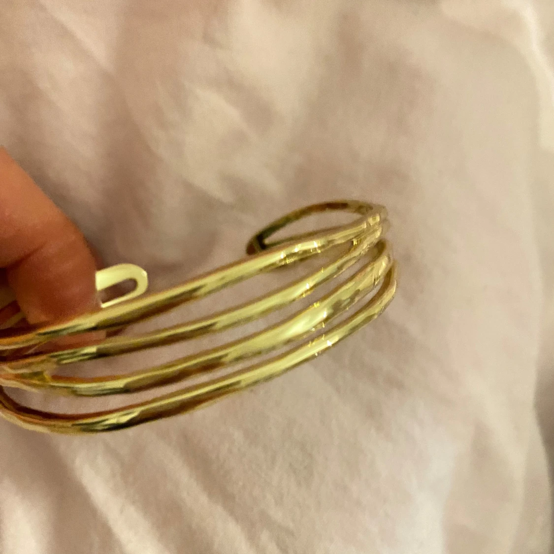 Elegant guldarmband med flera tunna band som skapar en stilren och modern look. Perfekt för att ge en touch av glamour till din outfit. Armbandet har en öppen design som gör det enkelt att justera efter handleden.