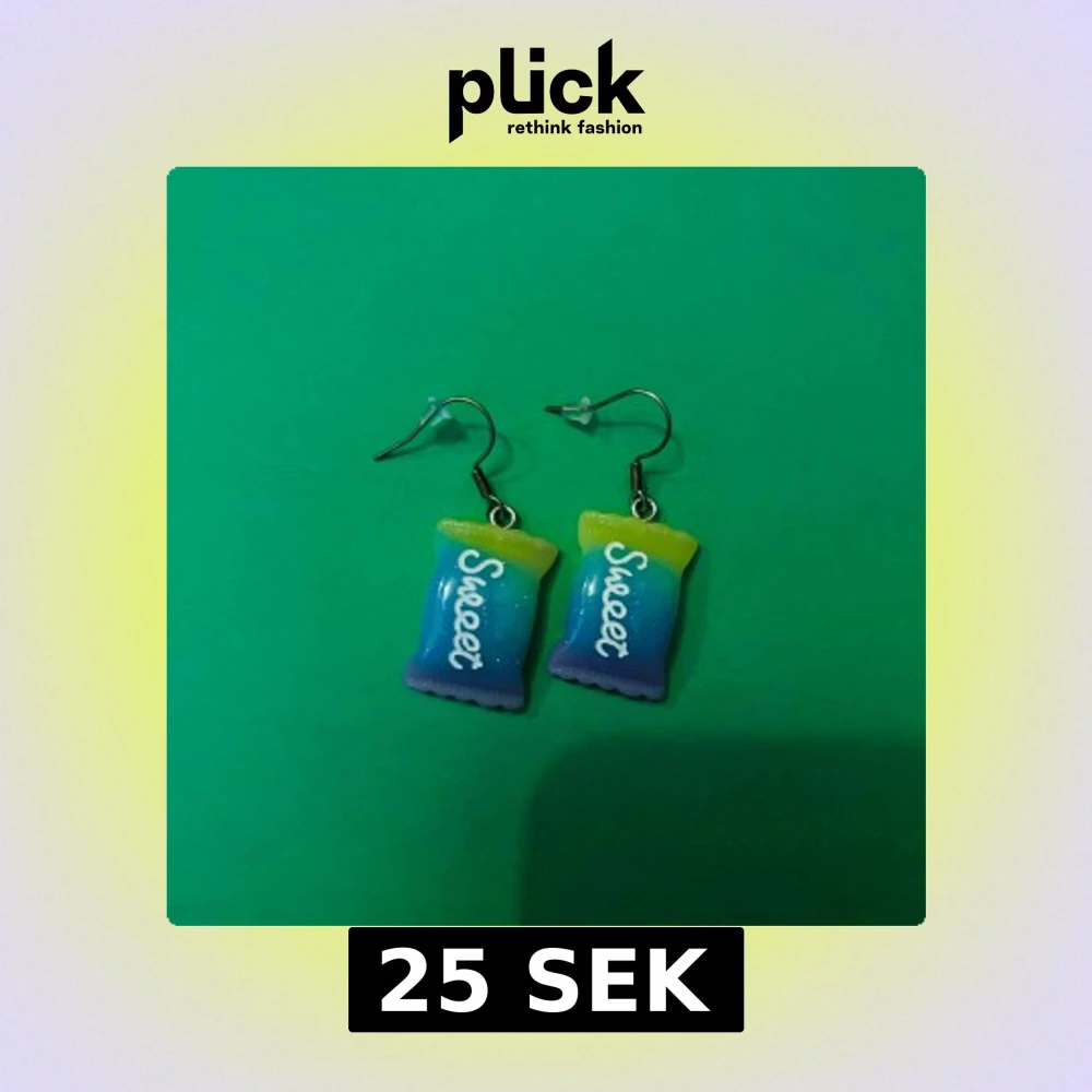 Unika örhängen formade som små godispåsar i blått, grönt och lila med texten 'Sweet' på framsidan. Perfekta för dig som vill sticka ut med ett lekfullt smycke.