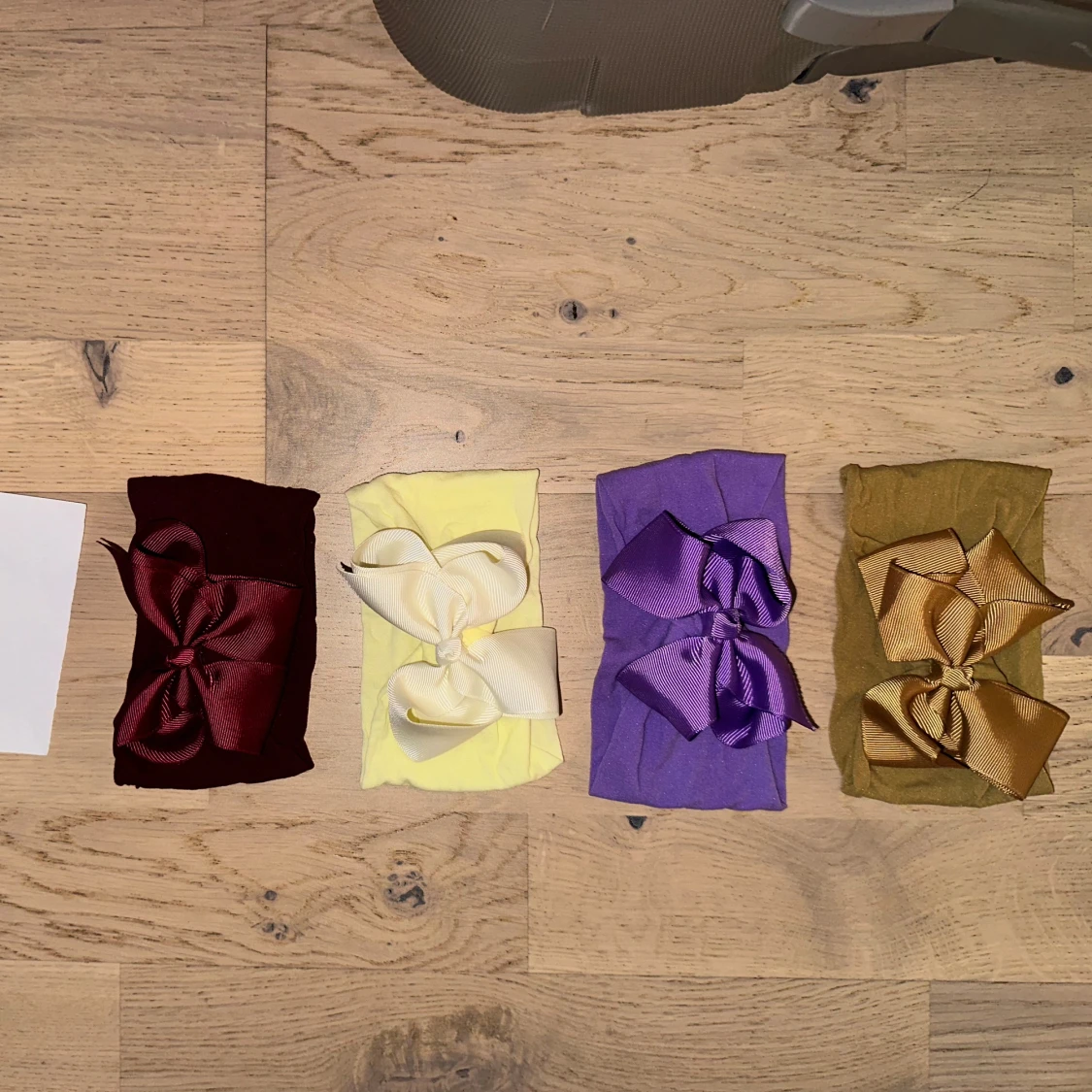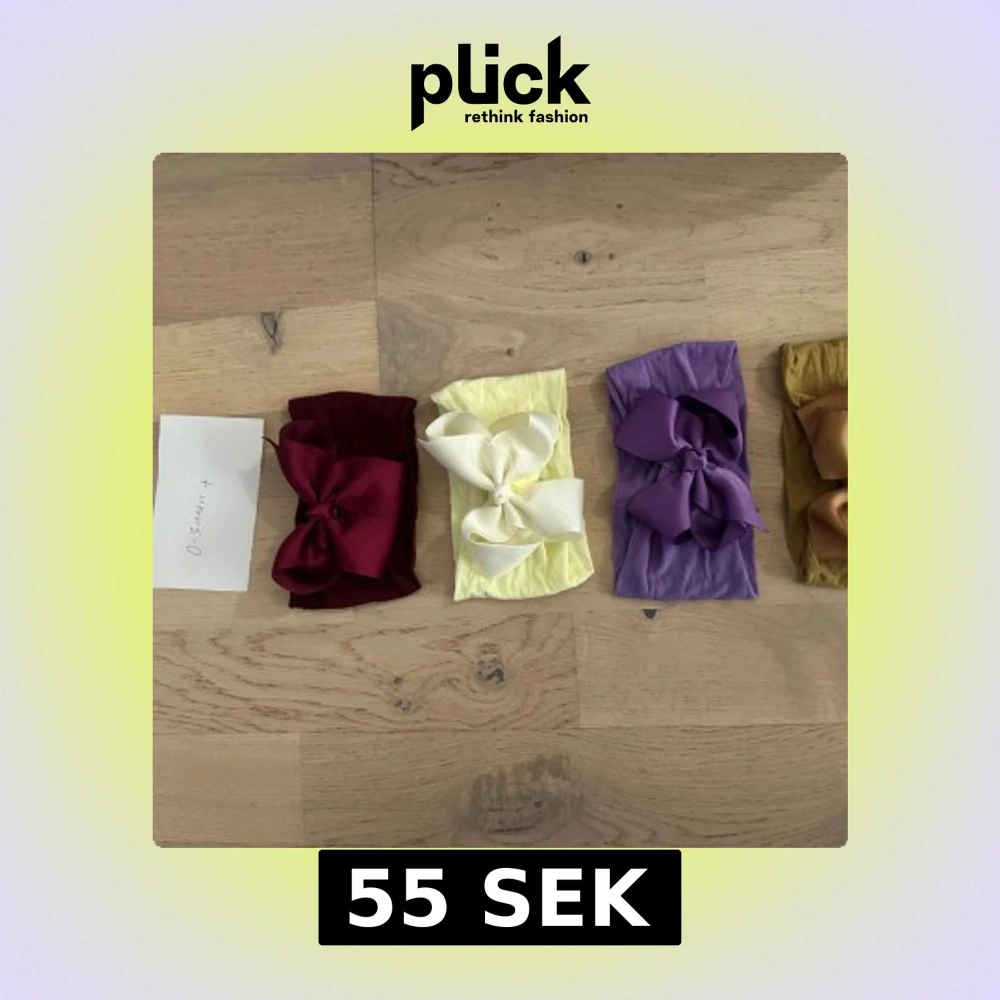 Säljer fyra mjuka diadem i olika färger: vinröd, ljusgul, lila och guldbrun. Varje diadem har en stor matchande rosett framtill och är tillverkade i stretchigt tyg, perfekta för att ge en söt touch till din look.