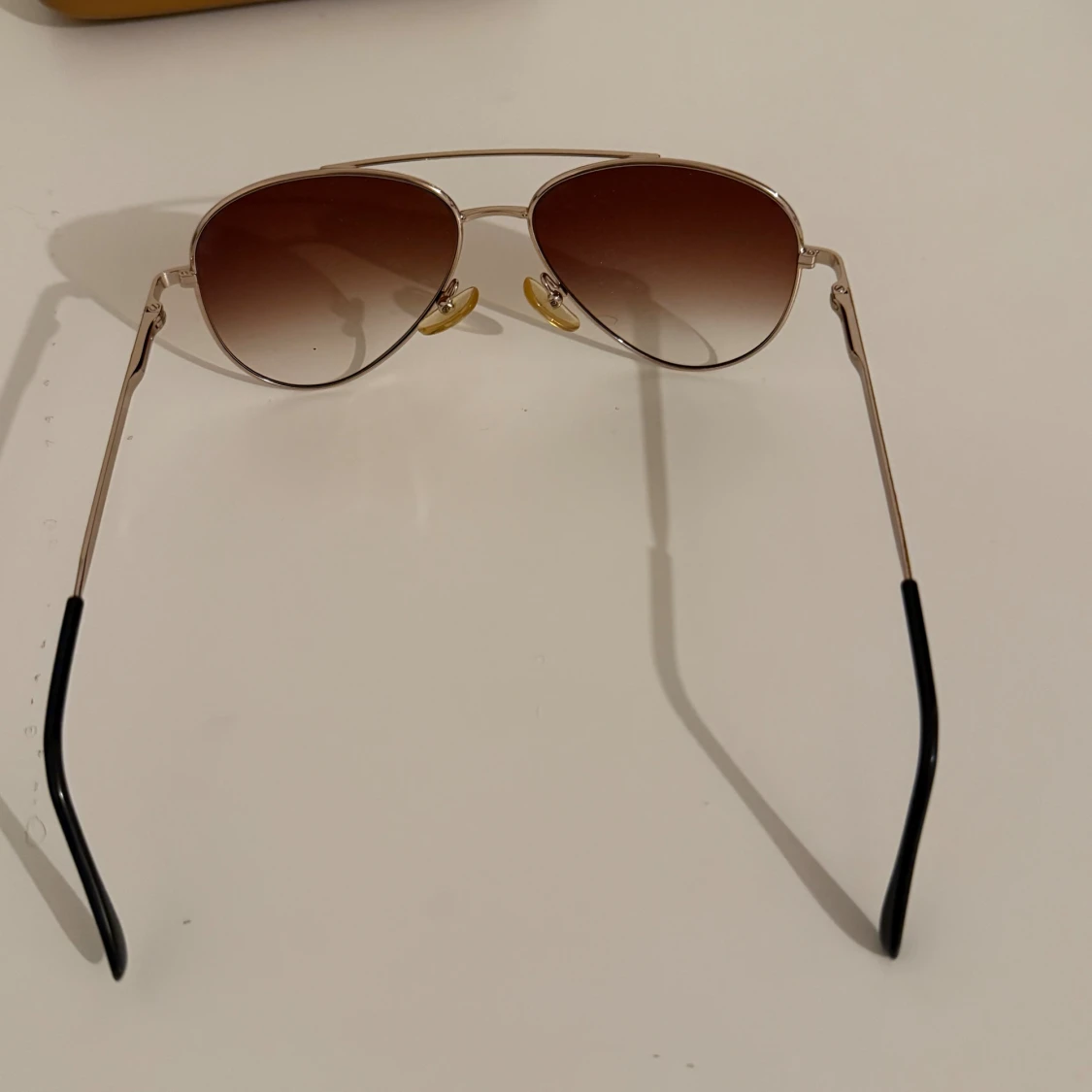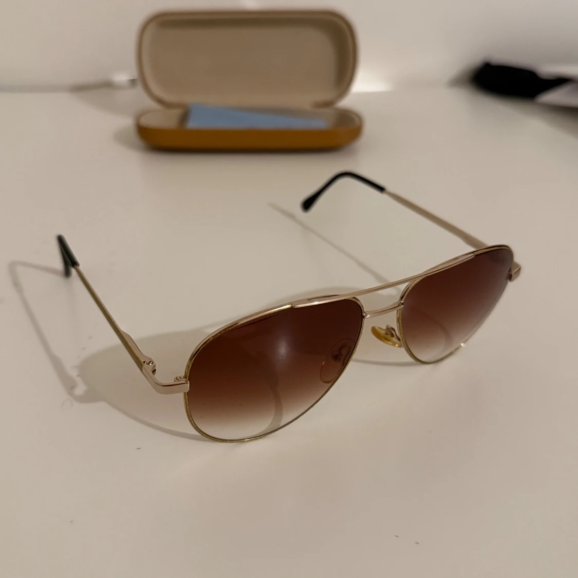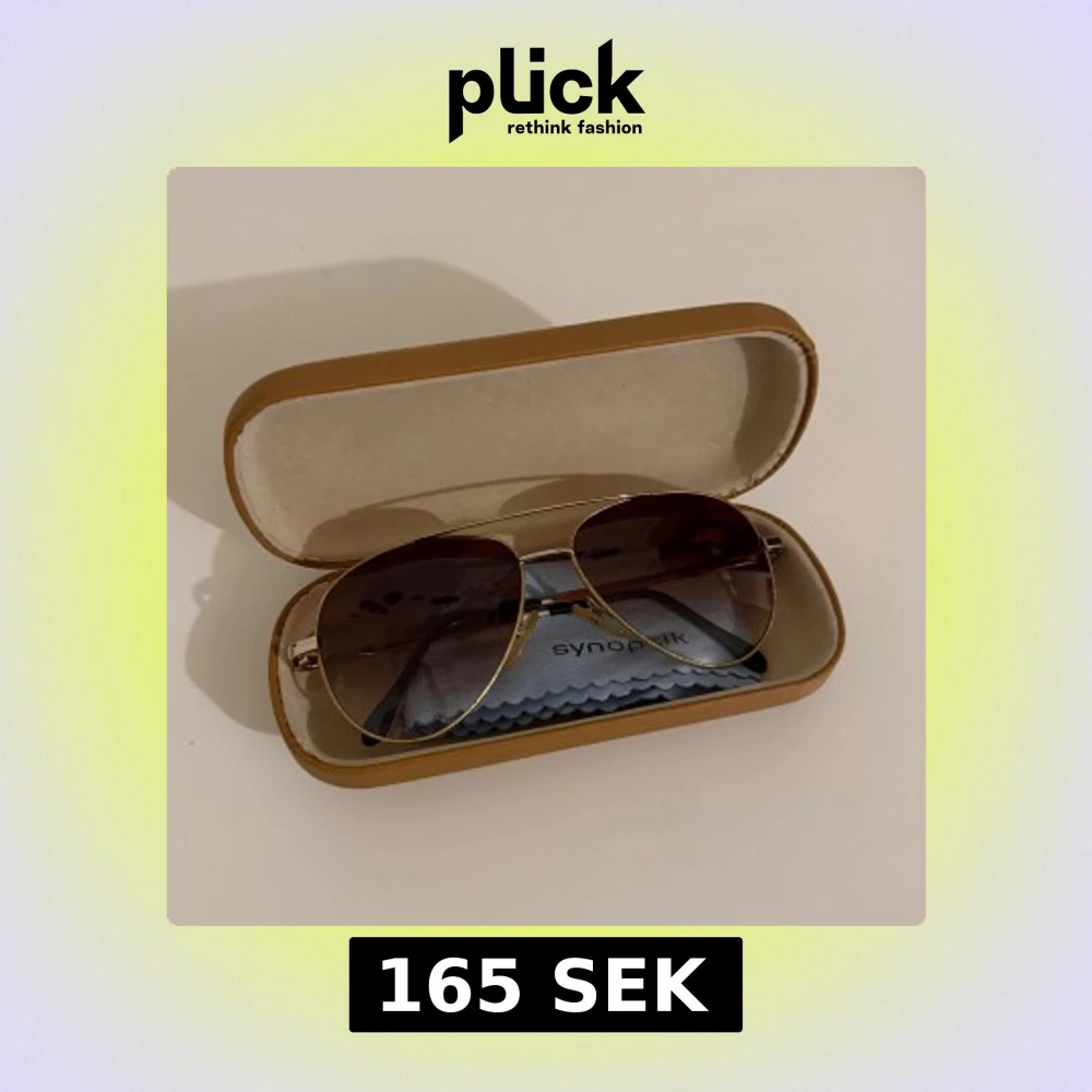Snygga aviator solglasögon från Synoptik med guldfärgad metallbåge och bruna tonade glas. Klassisk pilotform med svarta detaljer på skalmarna. Perfekta för att lyfta din stil under soliga dagar.