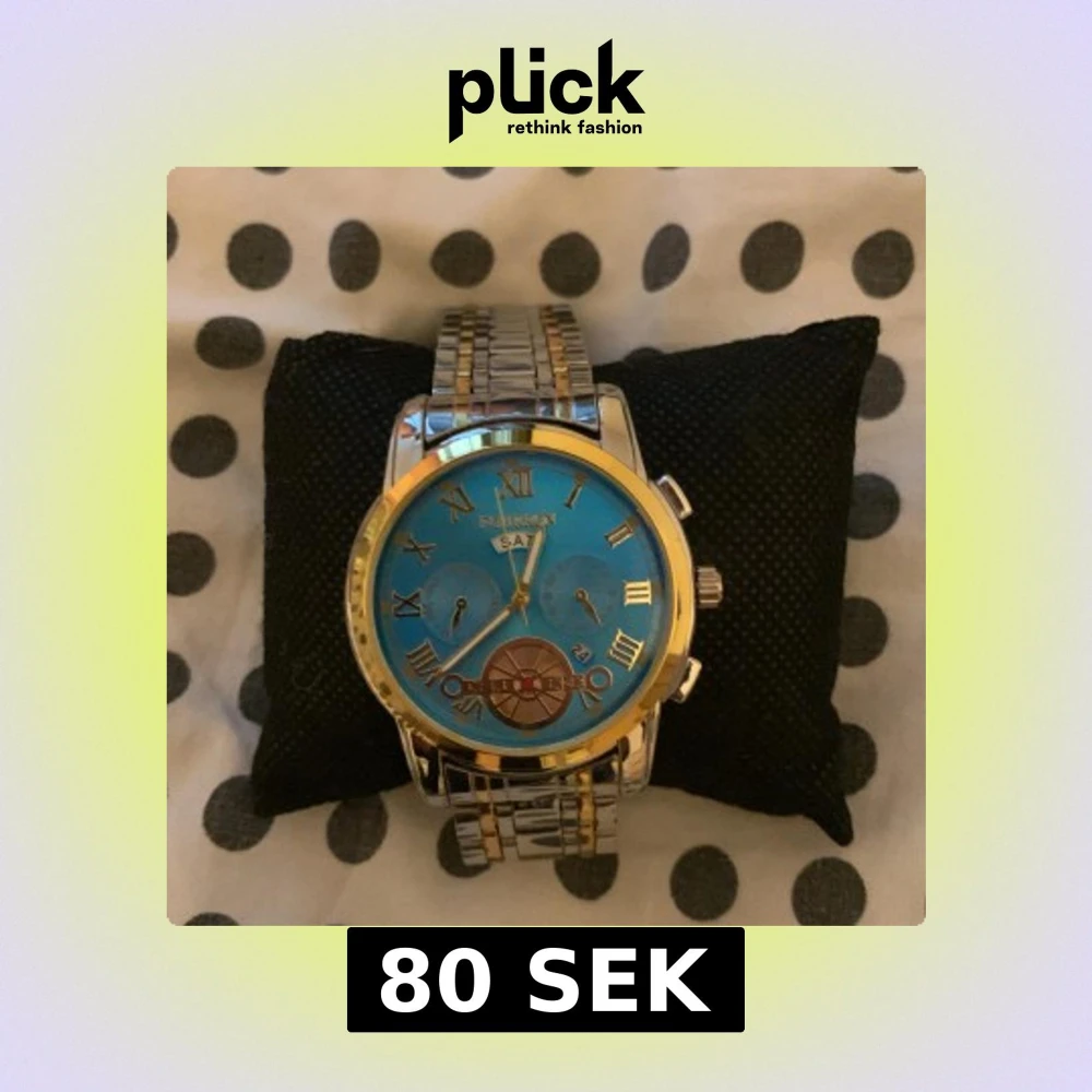 Snygg klocka med blå urtavla och romerska siffror i guld. Armbandet är i silver och guldtonad metall med länkdesign. Klockan har flera små urtavlor och detaljer i guld och brons. Perfekt för dig som gillar att sticka ut med accessoarer.