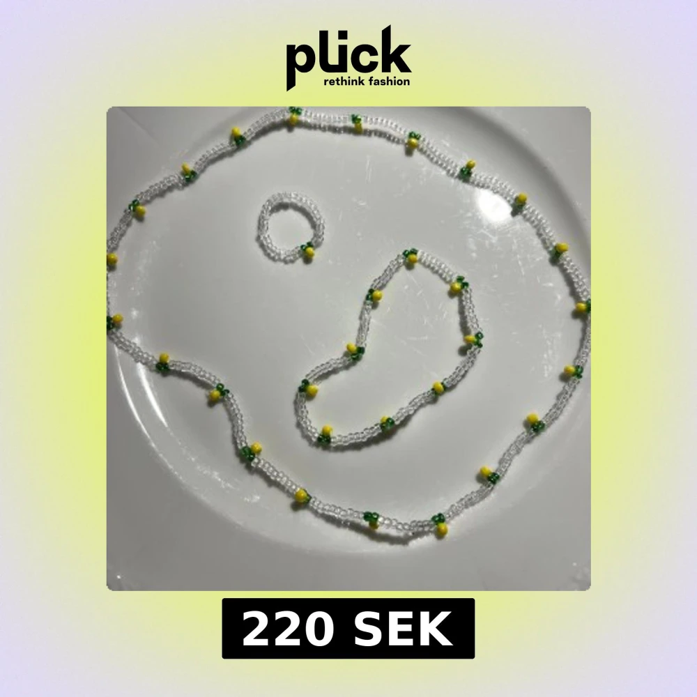 Handgjort set med halsband, armband och ring av små glaspärlor! Elastisk tråd vilket gör att de passar de flesta. Vid frågor är det bara att skriva!!