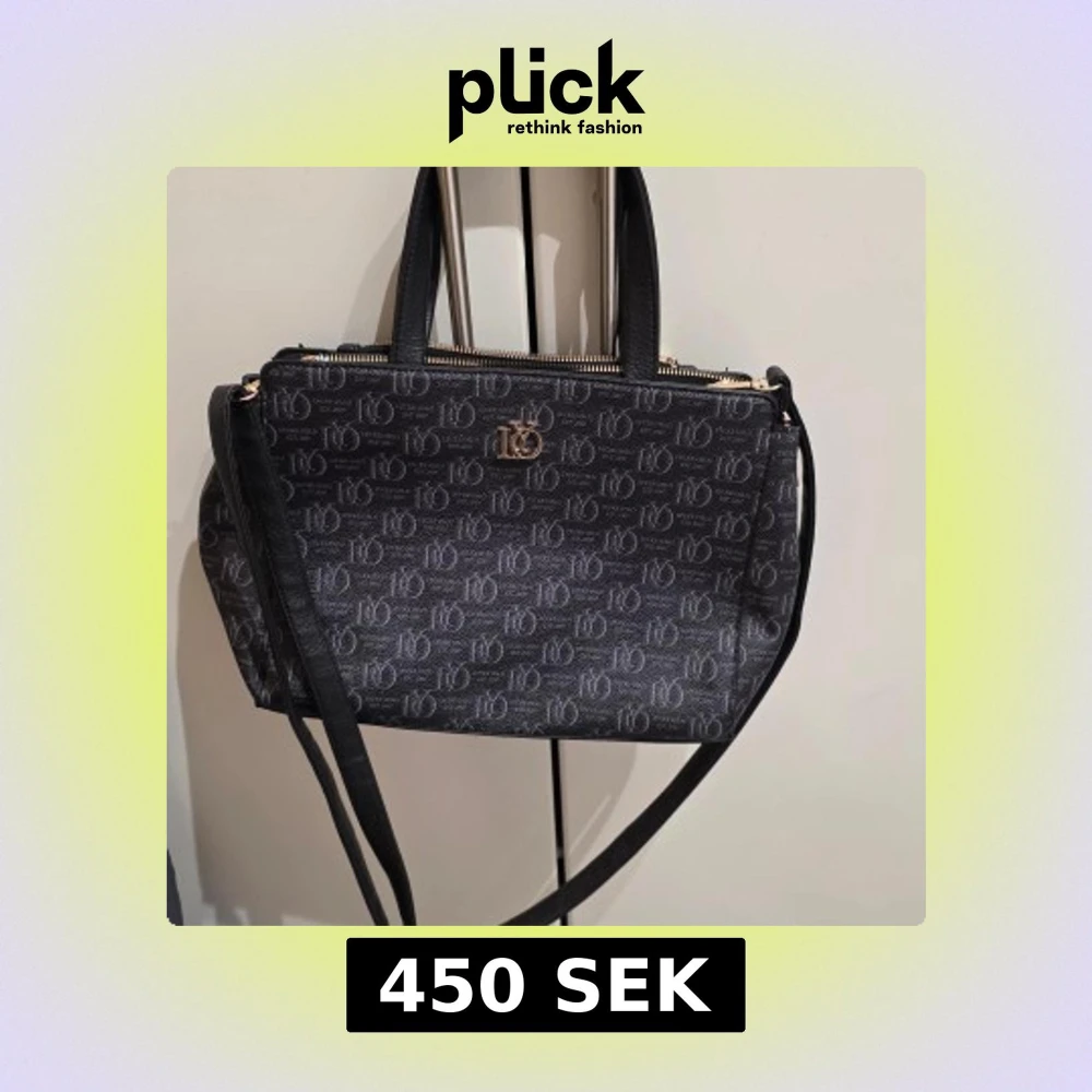 Snygg svart handväska från Lycke Oslo med mönstrad logga över hela väskan och guldfärgade detaljer. Väskan har både handtag och axelrem, samt dragkedja upptill. Materialet är skinnimitation med en stilren och modern look.