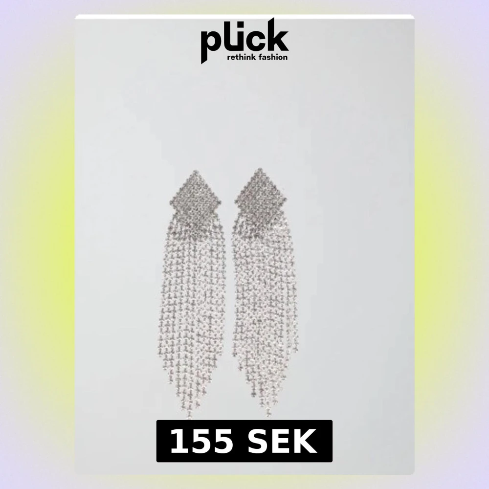 Säljer ett par statement örhängen i silverfärgad metall med massor av glittrande strass. De har en geometrisk diamantform upptill och långa hängande kedjor av strass som ger en riktigt lyxig och festlig vibe. Perfekta för att sticka ut och få all uppmärksamhet.