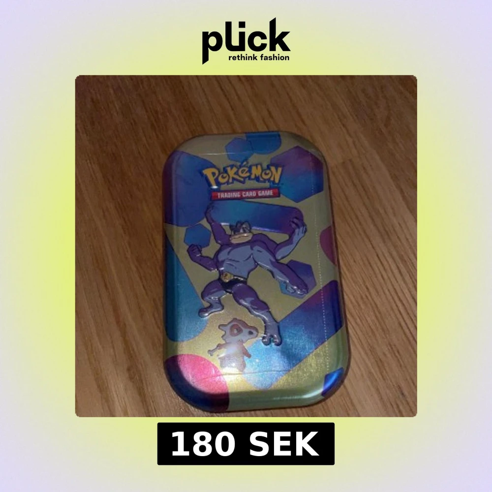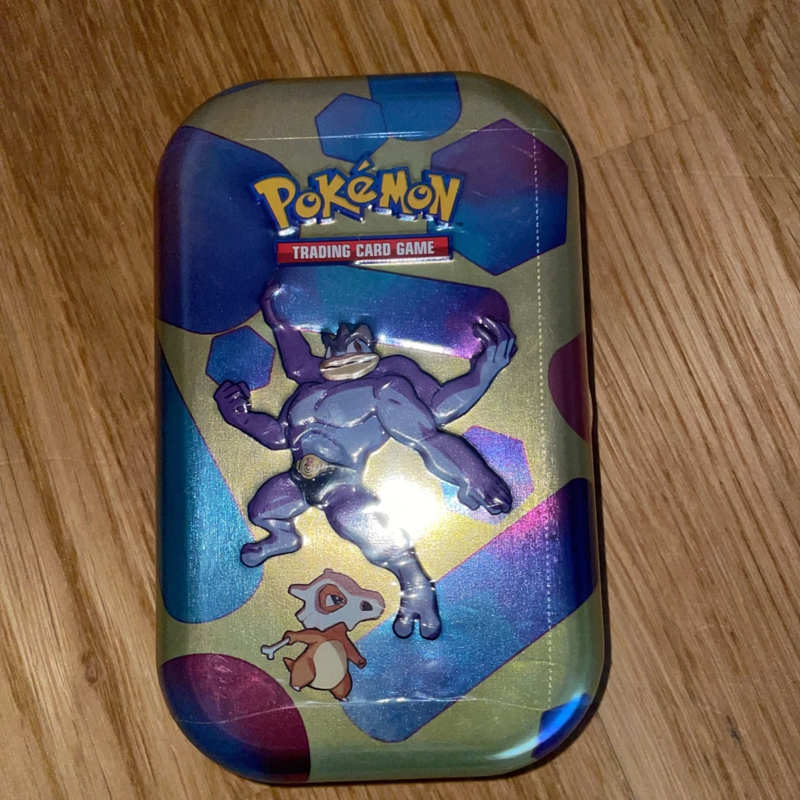 Säljer en Pokémon Trading Card Game Mini Tin med motiv av Machamp och Cubone. Perfekt för att förvara dina kort eller som samlarobjekt. Tinnet har en färgglad design med holografiska detaljer och innehåller booster packs från Scarlet & Violet-151 serien.