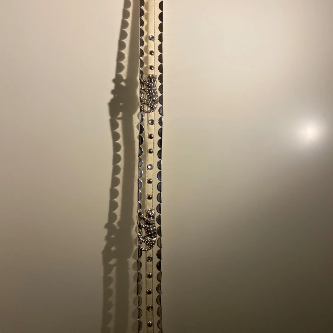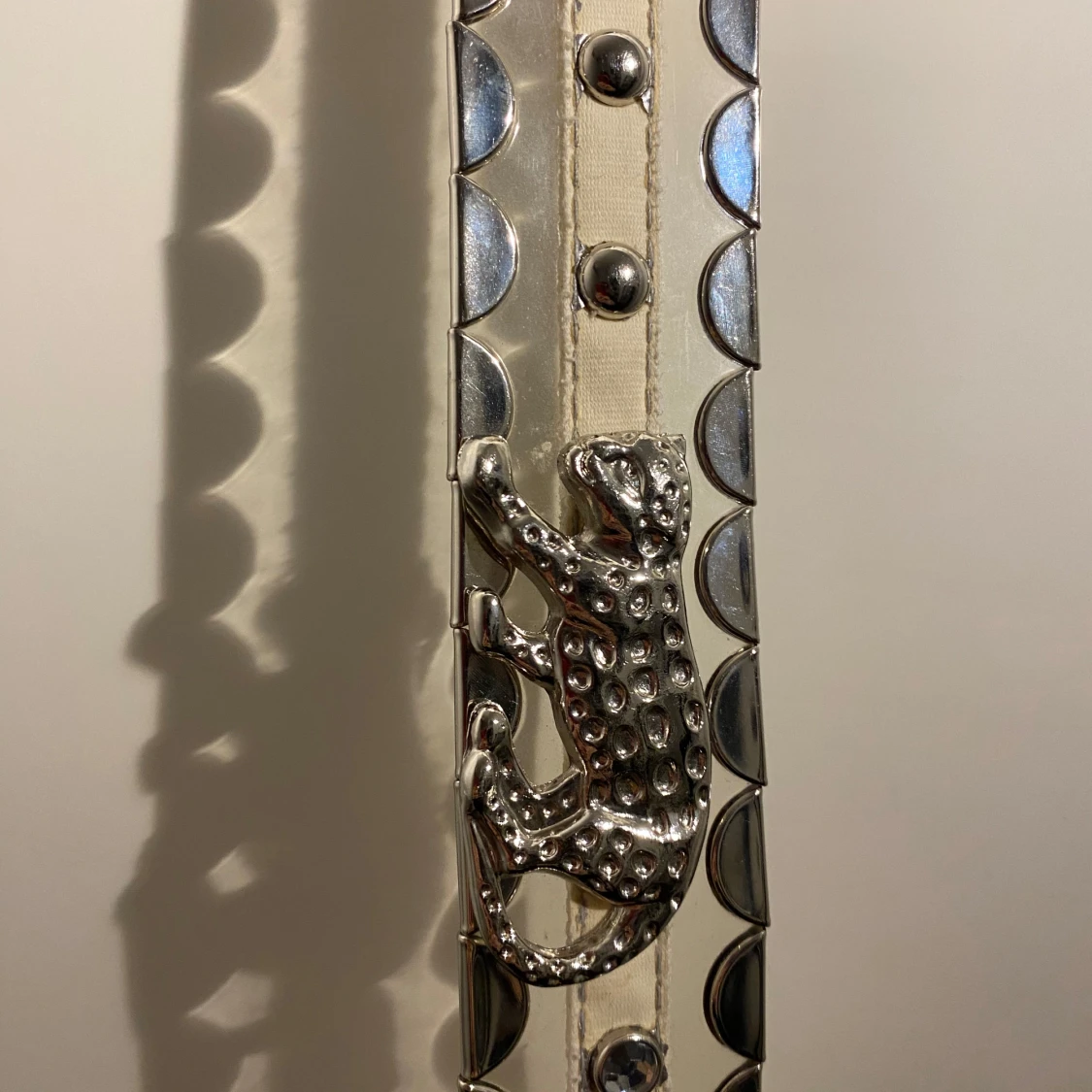 Snyggt beige bälte med coola silverdetaljer och en leopardfigur. Perfekt för att ge din outfit en unik touch. Bältet har en rad med nitar och en iögonfallande leopard i silver som ger en edgy känsla. Passar både till vardags och fest!