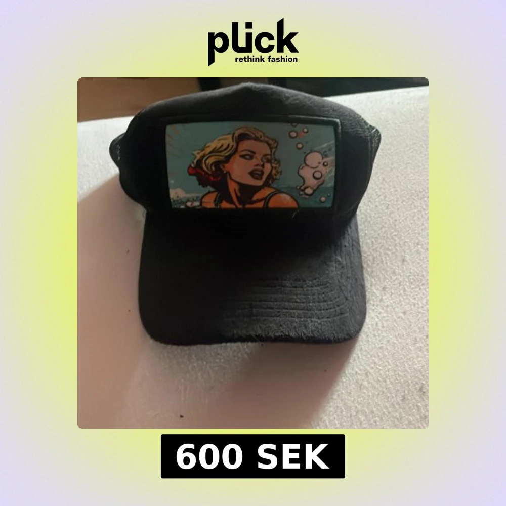 PRIS KAN DISKUTERAS! Cool svart truckerkeps med mesh på sidorna och ett stort pop art-inspirerat tryck framtill i färgerna blå, beige och orange. Kepsen har böjd skärm och justerbar baksida. Perfekt för dig som gillar unika accessoarer med konstnärlig vibe.