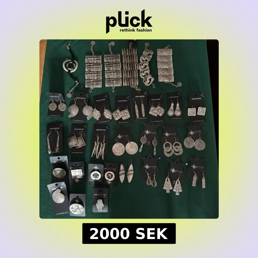 Samling med unika silvriga örhängen och breda armband i olika former och mönster. Örhängena har detaljer som spiraler, etniska mönster, geometriska former och pärldetaljer. Armbanden är chunky och har coola strukturer. Perfekt för dig som gillar statement-smycken och boho-vibe. OBS EJ FRÅN KINA, silverplaterade smycken av riktigt bra kvalitet! Har sålts tidigare och gått som smör, nu har jag ett parti kvar som jag säljer. 6 armband, 19 örhängen & 7 ringar.