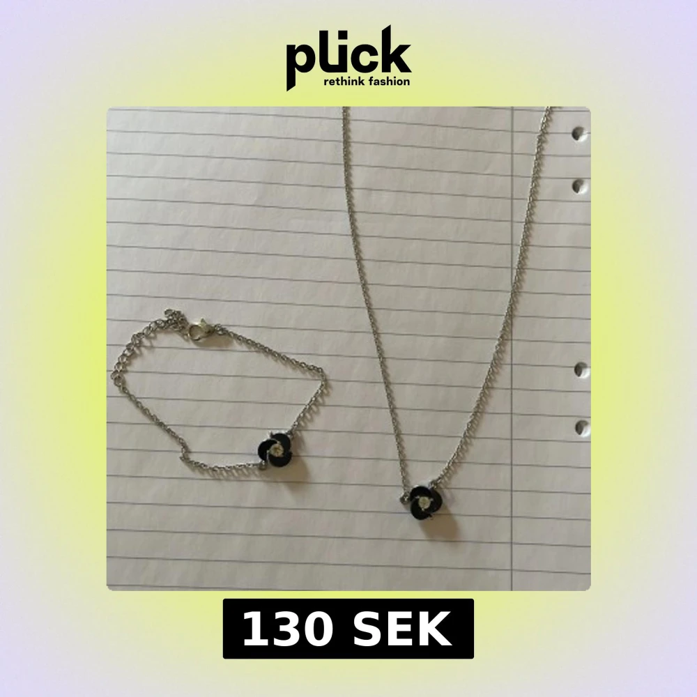 Elegant smyckeset bestående av ett halsband och ett armband. Båda smyckena har en svart blomma med en glittrig detalj i mitten. Kedjorna är i silverfärg och ger en stilren look. Perfekt för att komplettera din outfit med en subtil men chic touch.
