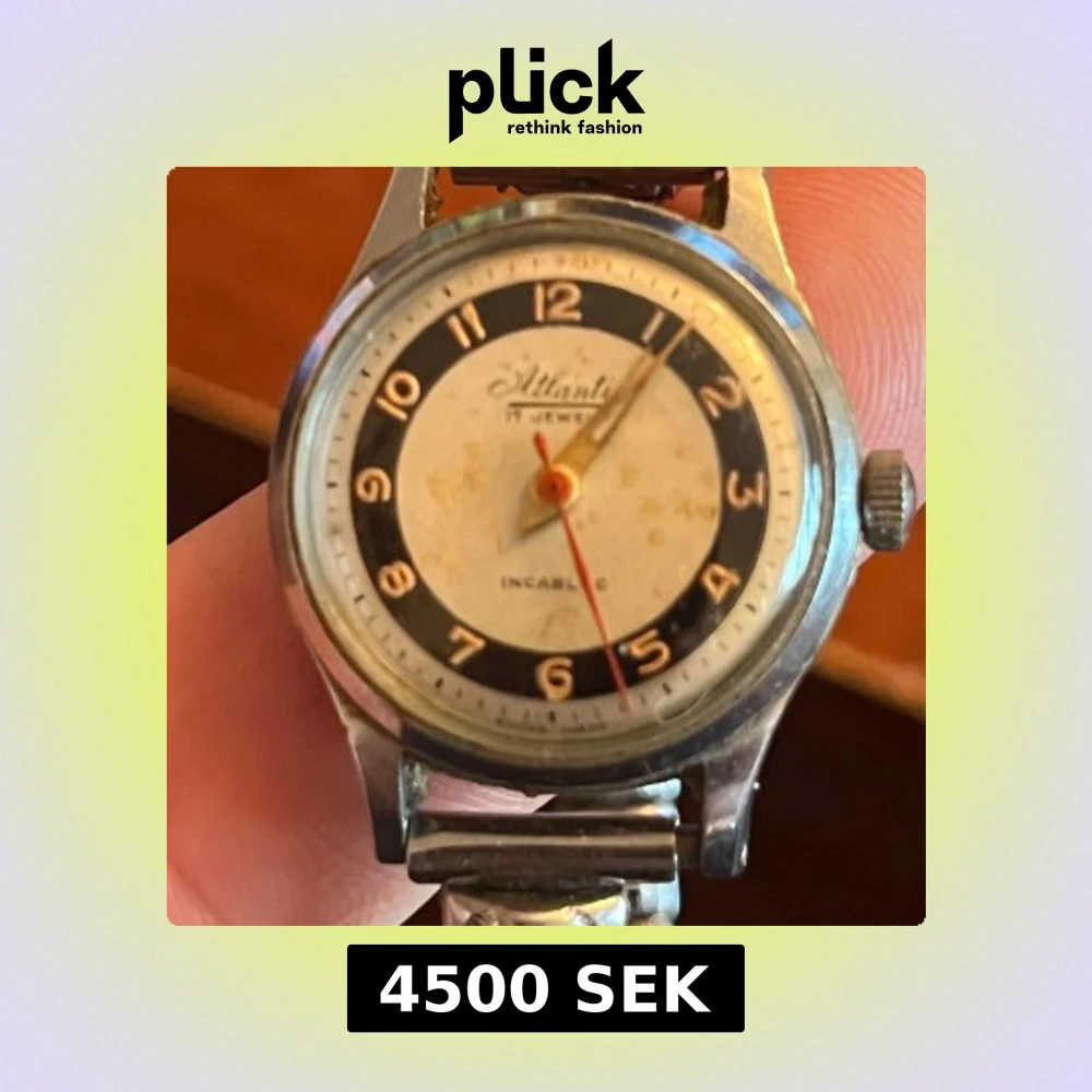 Säljer en vintage klocka från Atlantic med 17 juveler. Den har en klassisk design med en vit urtavla och svarta detaljer. Boetten är i rostfritt stål och armbandet är elastiskt för bekväm passform. Perfekt för den som gillar retrostil!