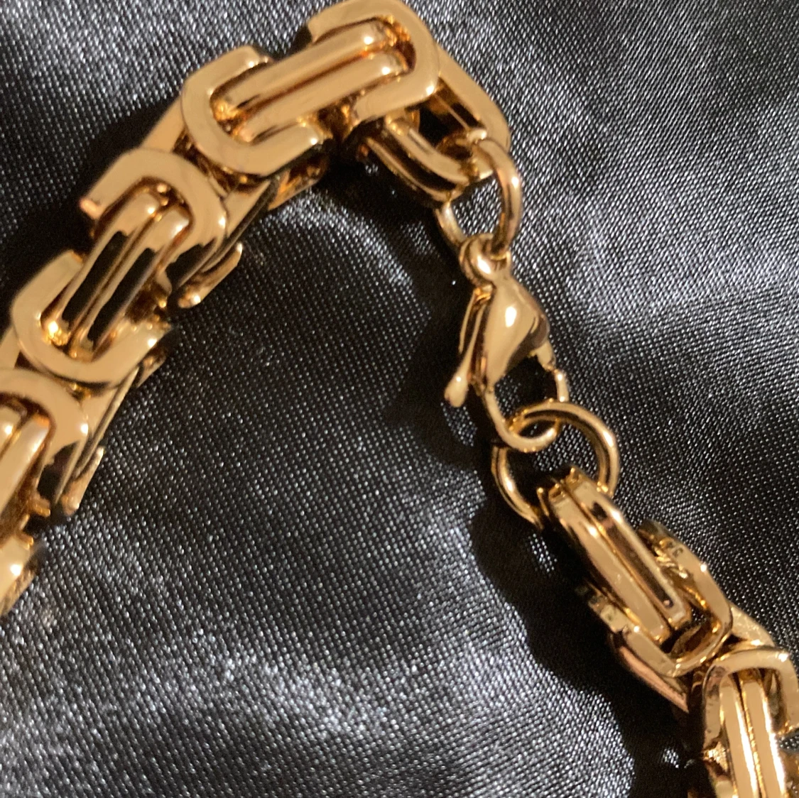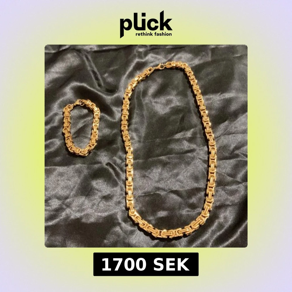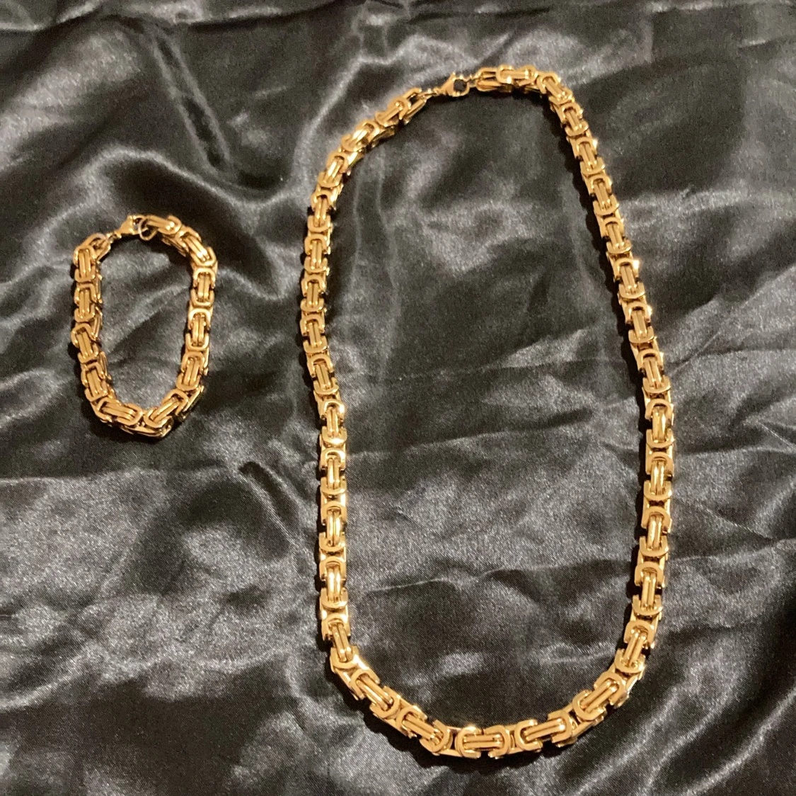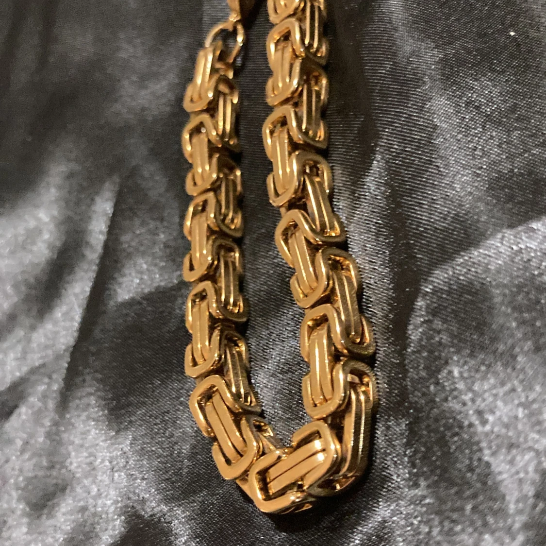 Säljer ett halsband som väger 150 g. Längden är 60 cm och bredden 8 mm. Halsbandet är tillverkat av äkta 18K guld och doppat i PVD för extra hållbarhet och glans cirka. Till halsbandet finns även ett matchande armband 60 g 8mm bredd. Kvaliteten är mycket hög, bättre finns inte i denna klass.