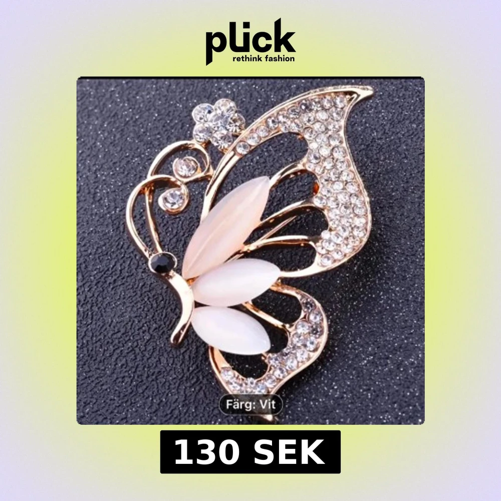 Elegant fjärilsbrosch i vit och guld med glittrande strassdetaljer. Perfekt för att ge en extra touch till din outfit.