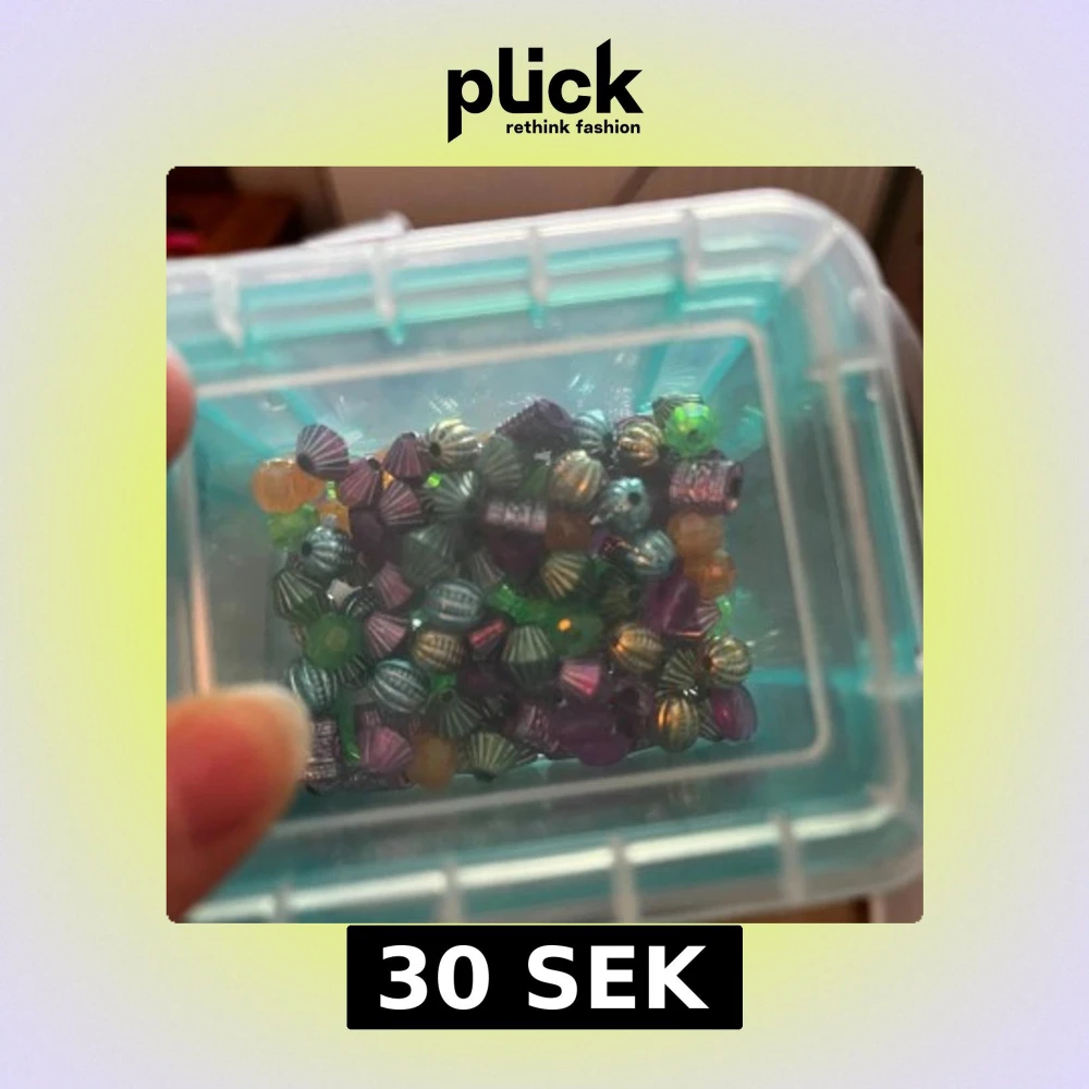 En ask med mixade plastpärlor i olika färger som lila, grön, blå, orange och turkos. Pärlorna har räfflad yta och varierande former, perfekta för att skapa egna smycken eller armband.