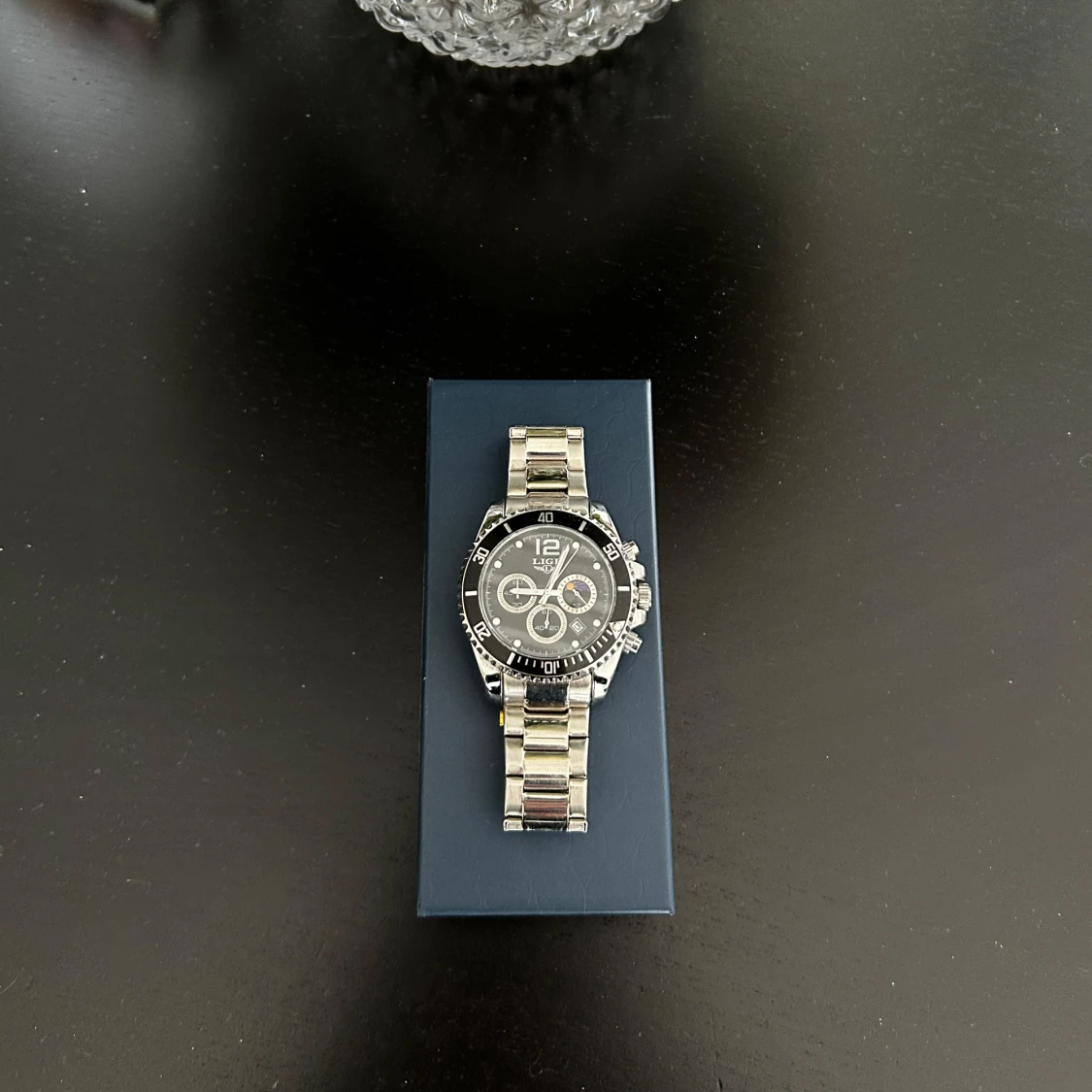 Snygg silverfärgad klocka från LIGE med svart urtavla och kronografdetaljer. Klockan har en robust metallarmband och tydliga markeringar på urtavlan. Perfekt för den som gillar en stilren och modern look.
