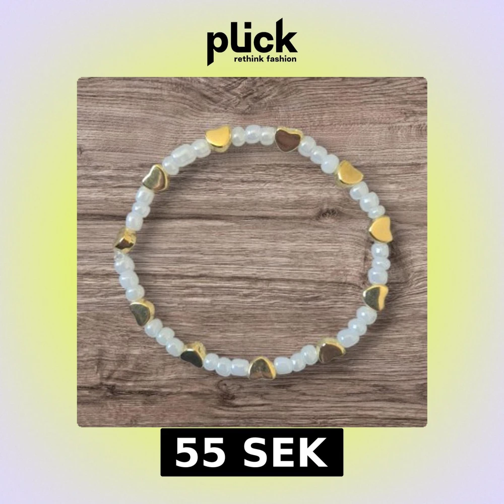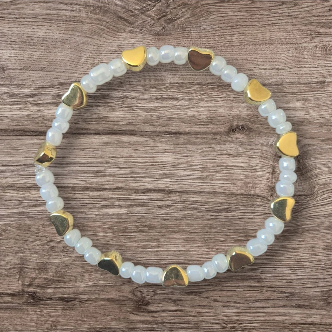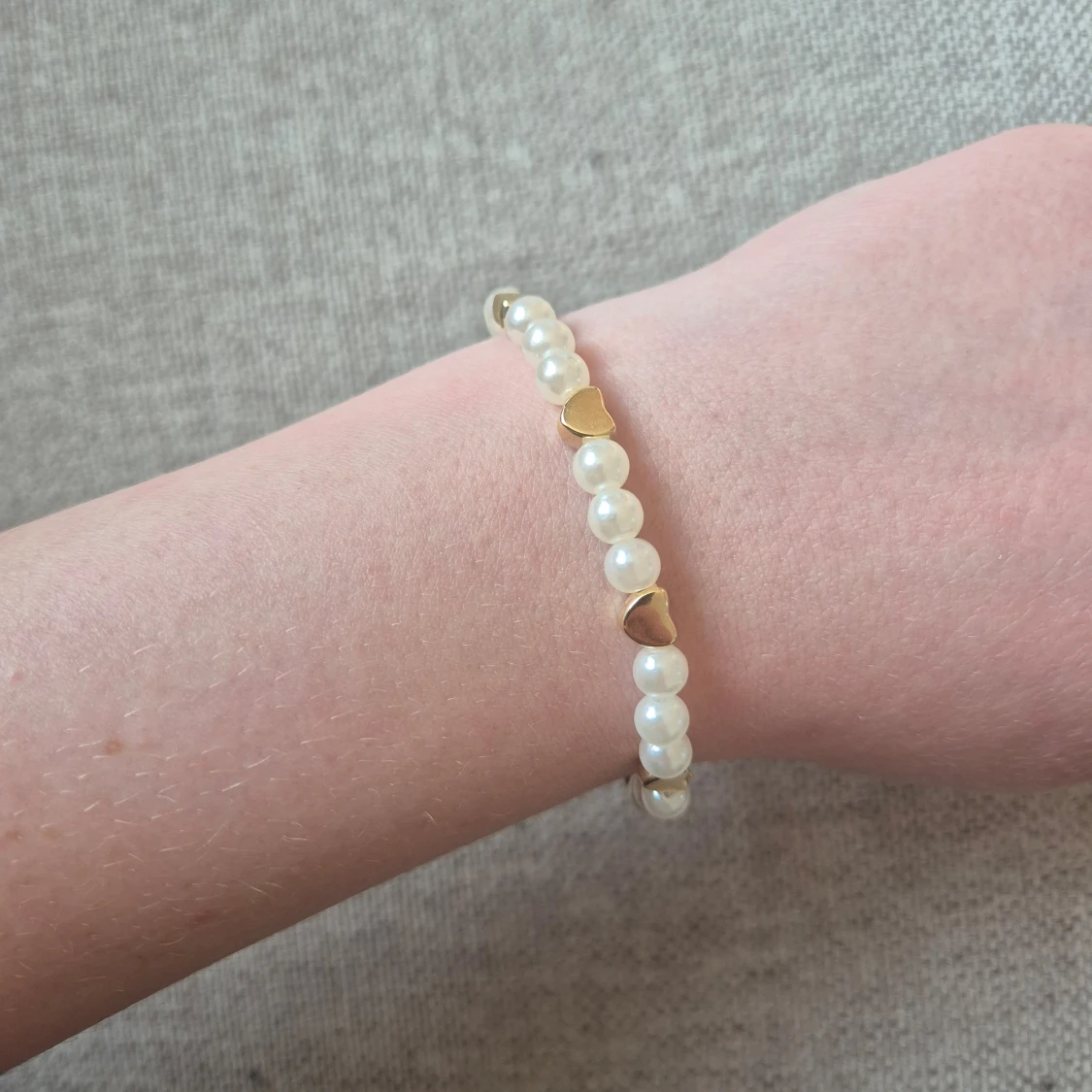 Charmigt armband med vita pärlor och guldfärgade hjärtan. Perfekt accessoar för att ge en elegant touch till din outfit. Elastiskt band för enkel passform.