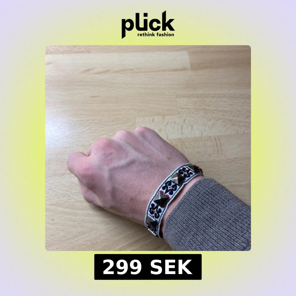 Unikt armband med svart och vitt mönster och dekorativa nitar. Armbandet har justerbara snören för perfekt passform och en röd detalj som ger en extra touch. Perfekt för att ge din outfit en edgy stil.
