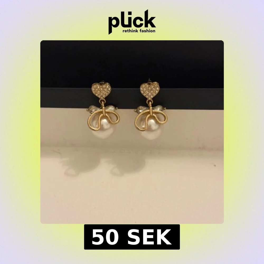 Eleganta guldörhängen med hjärtformade detaljer prydda med små stenar. Under hjärtat hänger en vacker vit pärla inramad av en dekorativ rosett. Perfekta för att ge en touch av glamour till din outfit.