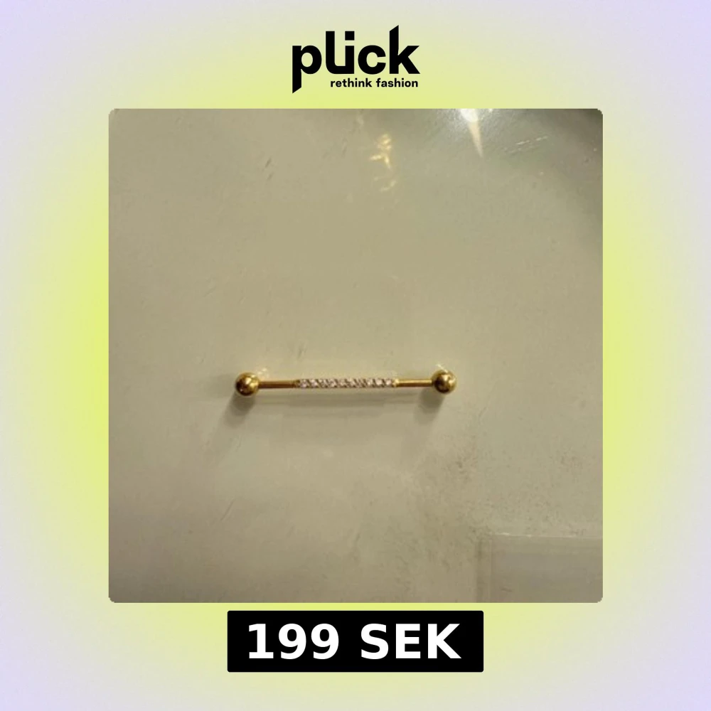 Snygg industrial barbell från Wildcat i guldigt stål med glittrande kristaller längs mitten. Stavens längd är 34 mm och kulorna är 5 mm. Perfekt för dig som vill ha lite extra bling i din piercing.