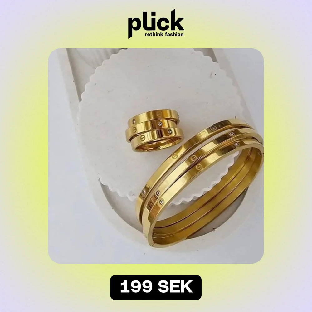 Säljer ett set med eleganta rostfritt stål gulda färg armband och matchande ringar. Armbandet och ringarna har små gnistrande stenar som ger en lyxig känsla. Perfekt för festliga tillfällen eller som en fin present. De är i mycket bra skick och redo att bäras med stil.