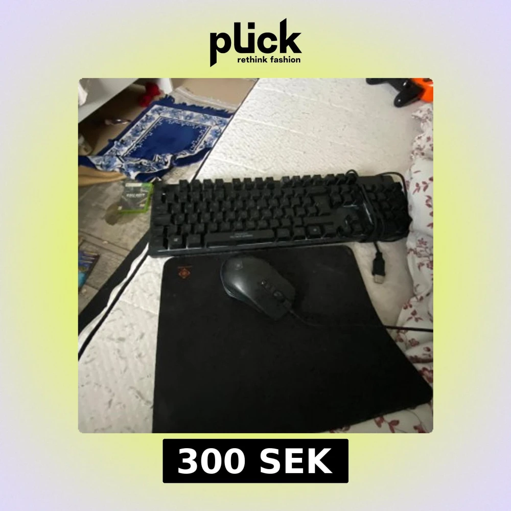 Bilderna visar ett tangentbord och en datormus från DELTACO GAMING, alla grejerna ingår och en grej kostar 100 kr. så om du vill köpa alla tre så kostar det 300