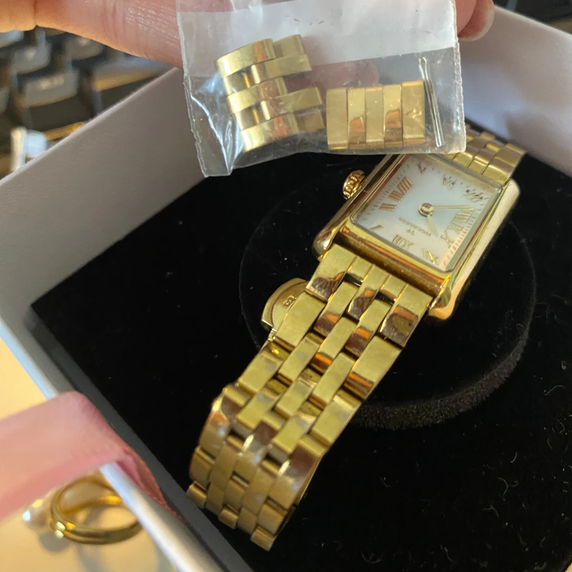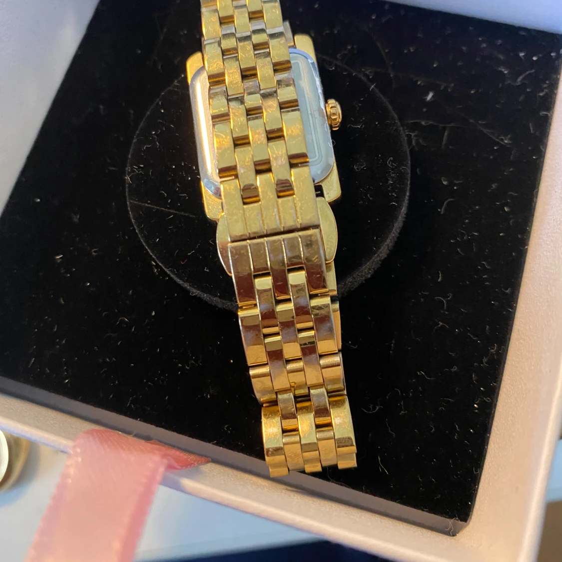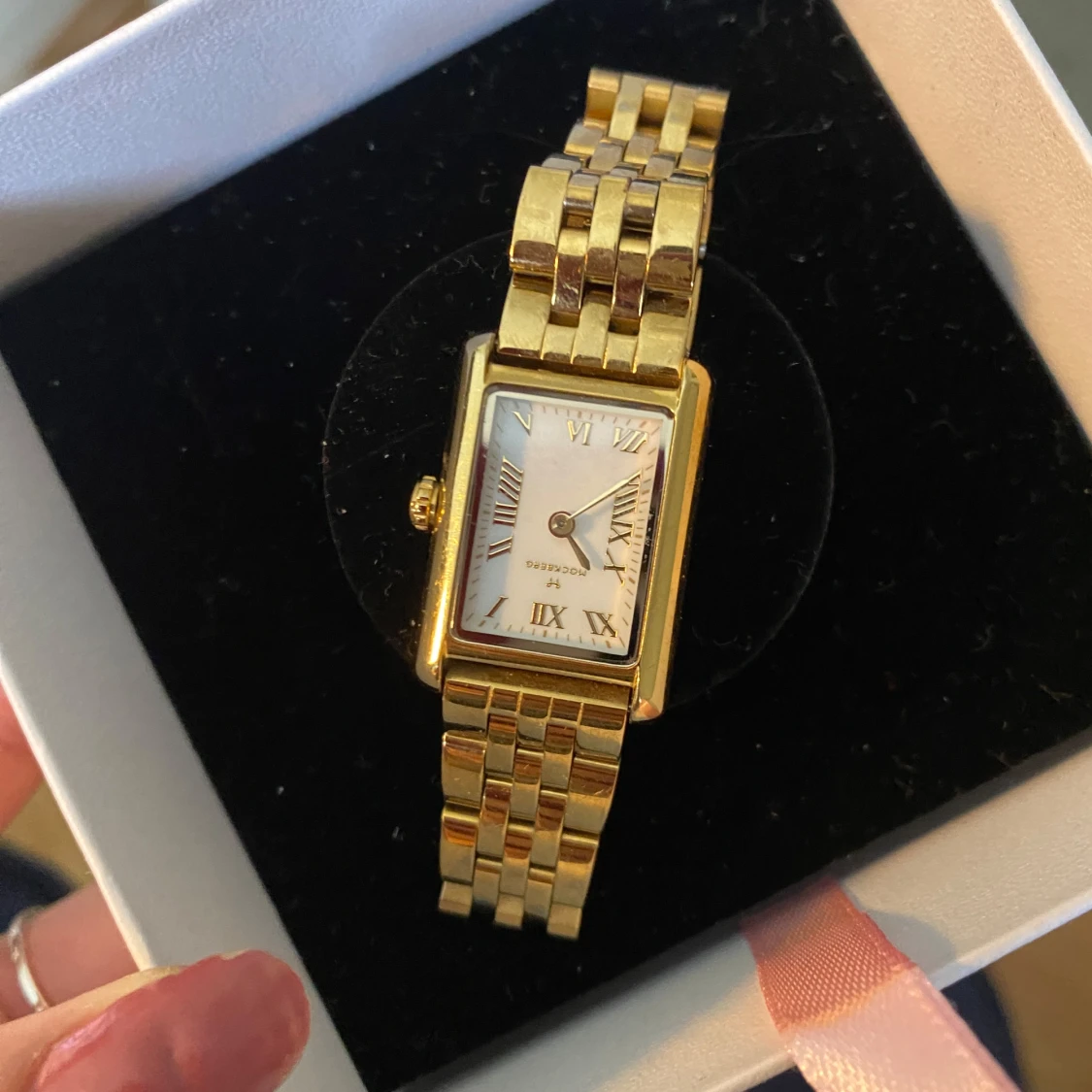 Säljer en elegant guldfärgad klocka från Mockberg med fyrkantig vit urtavla och romerska siffror. Klockan har ett klassiskt länkarmband i metall och levereras med extra länkar för justering av storlek.