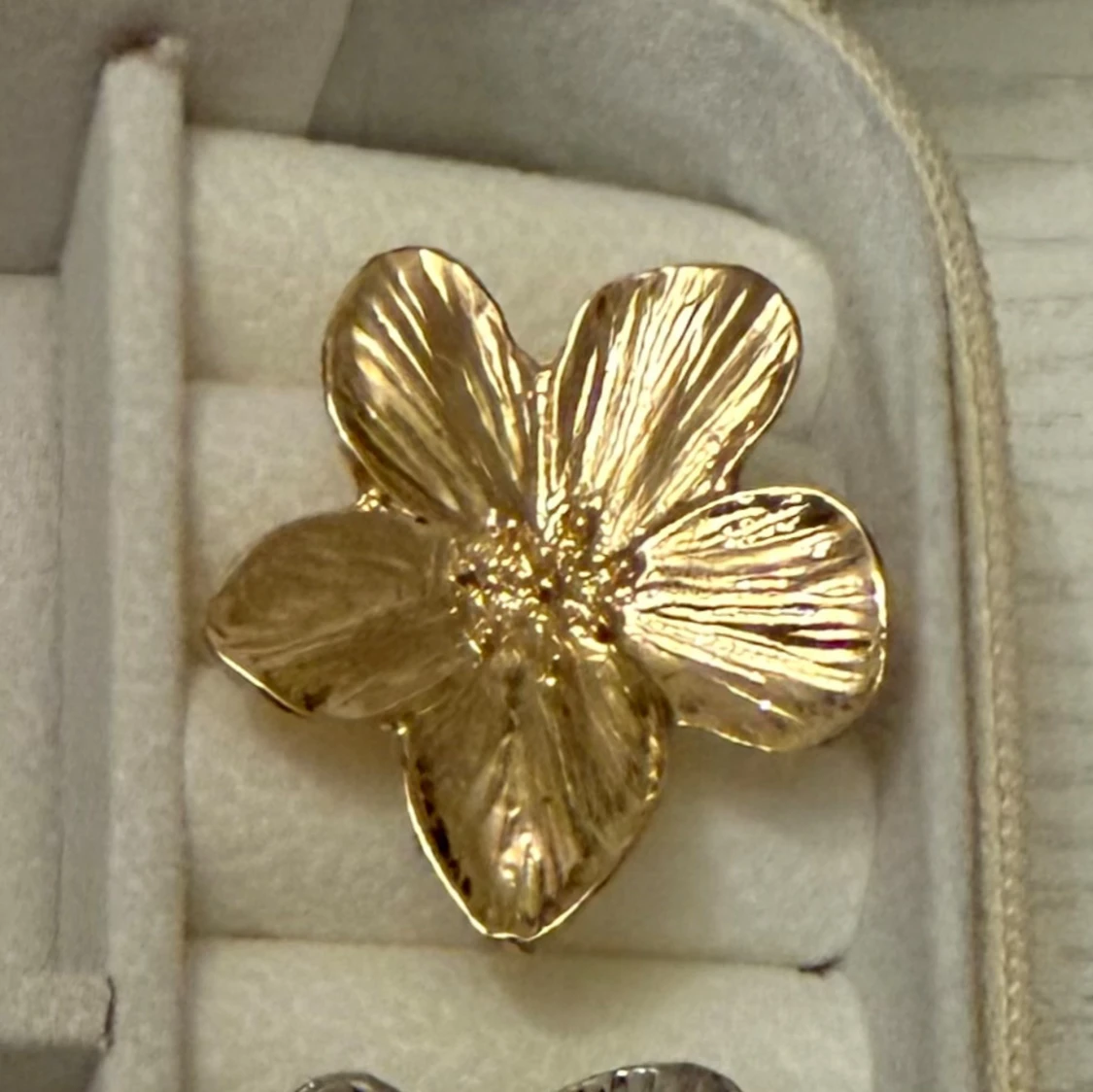 Två stora ringar i form av blommor, en i guld och en i silverfärg. Båda har detaljerade blomblad med en glansig finish som ger ett lyxigt intryck. Perfekta för dig som vill sticka ut med ett unikt smycke. ( styck pris)