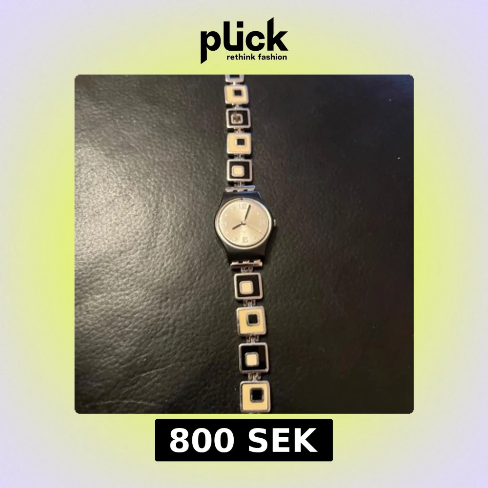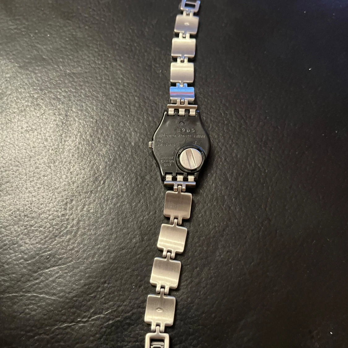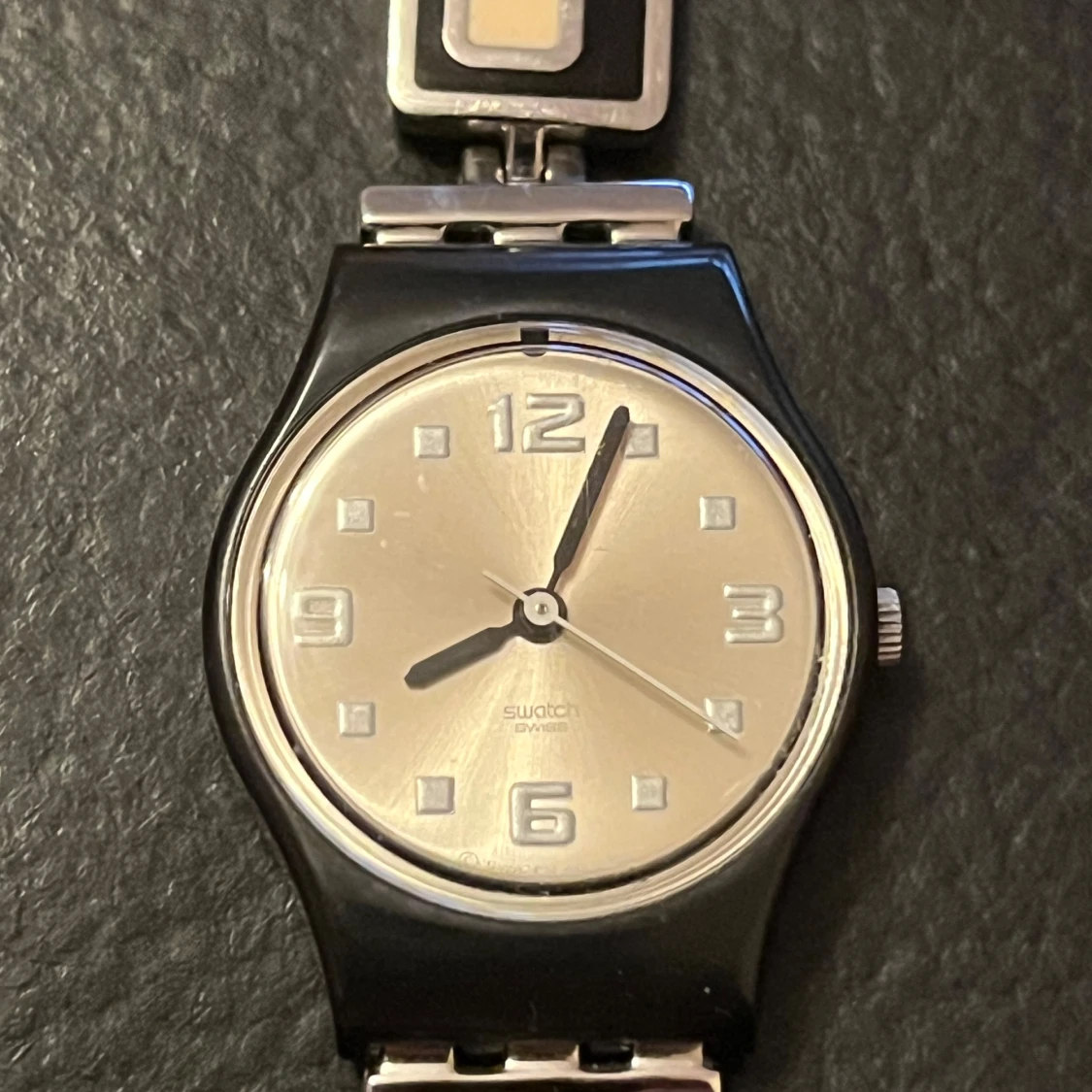 Snygg klocka från Swatch med en unik länkdesign i svart och silver. Urtavlan är silverfärgad med tydliga siffror och visare. Klockan är vattentålig och tillverkad i Schweiz. Perfekt för dig som gillar stilrena accessoarer.