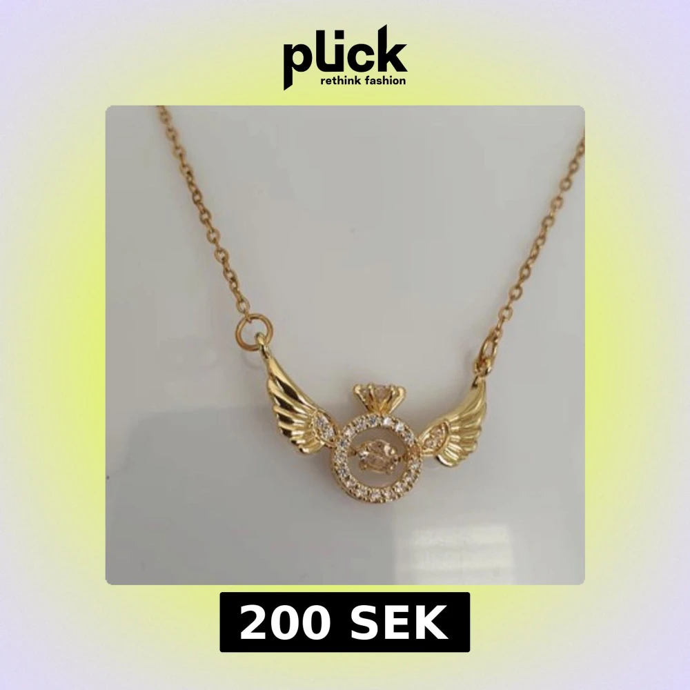 Elegant guldhalsband med ett unikt hängsmycke i form av vingar och en cirkel dekorerad med glittrande stenar. Perfekt för att ge en touch av glamour till din stil.