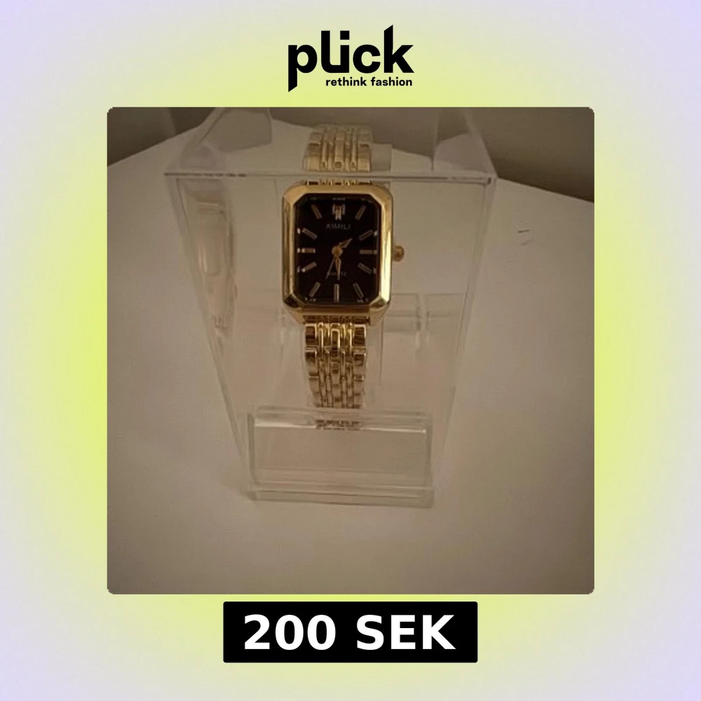 Stilren klocka med fyrkantig urtavla i svart och guldig boett. Armbandet är i guldtonad metall med snygg länkdesign. Klockan har tydliga indexmarkeringar och klassisk kvartsrörelse. Perfekt accessoar för en trendig look.